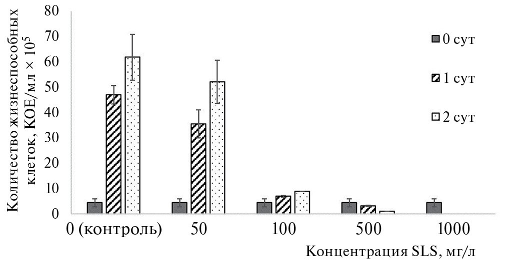 Результаты оценки жизнеспособности микроорганизмов в исследуемых БТЭ демонстрируют взаимосвязь снижения электрогенной активности под действием ПАВ с ингибированием роста культуры и при определенных концентрациях загрязнителя – ее гибелью. Так, при добавлении 100 мг/л SLS количество жизнеспособных клеток за 2 сут инкубирования увеличивалось менее значительно (в 2 раза от исходного) по сравнению с контрольным вариантом (с 4.39·105 до 61.8·105 КОЕ/мл, т.е. в 14 раз от исходного). Повышение концентрации SLS до 500 мг/л приводило к сокращению количества жизнеспособных клеток – с 4.39·105 (исходное количество) до 9.5·104 КОЕ/мл (на 2 сут инкубирования). При 1000 мг/л SLS в среде жизнеспособные клетки M. luteus не обнаруживались методами посева, что позволяет говорить об их гибели (рис. 7).
