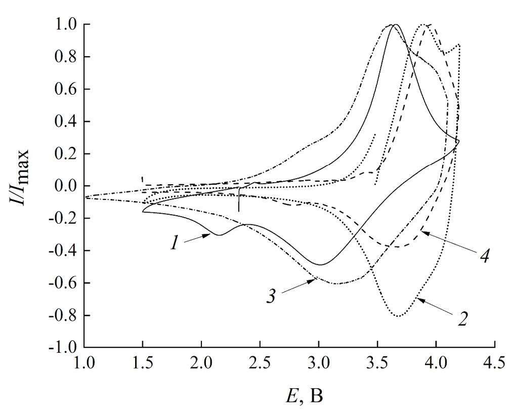 Рис. 5. ЦВА образцов ТТЛИА с различными анодами. Нумерация на рисунке соответствует образцам с анодами: 1 – Si@O@Al-154 нм, 2 –Si@O@Al-15 нм, 3 – LixSi@O@Al и 4 – “безанодный”. Скорость развертки потенциала – 0.5 мВ/c, пределы циклирования 1.5 В-4.2 для ТТЛИА с анодами Si@O@Al-154, Si@O@Al-15 нм и “безанодного” образца, 1.0-4.1 В для образца LixSi@O@Al.
