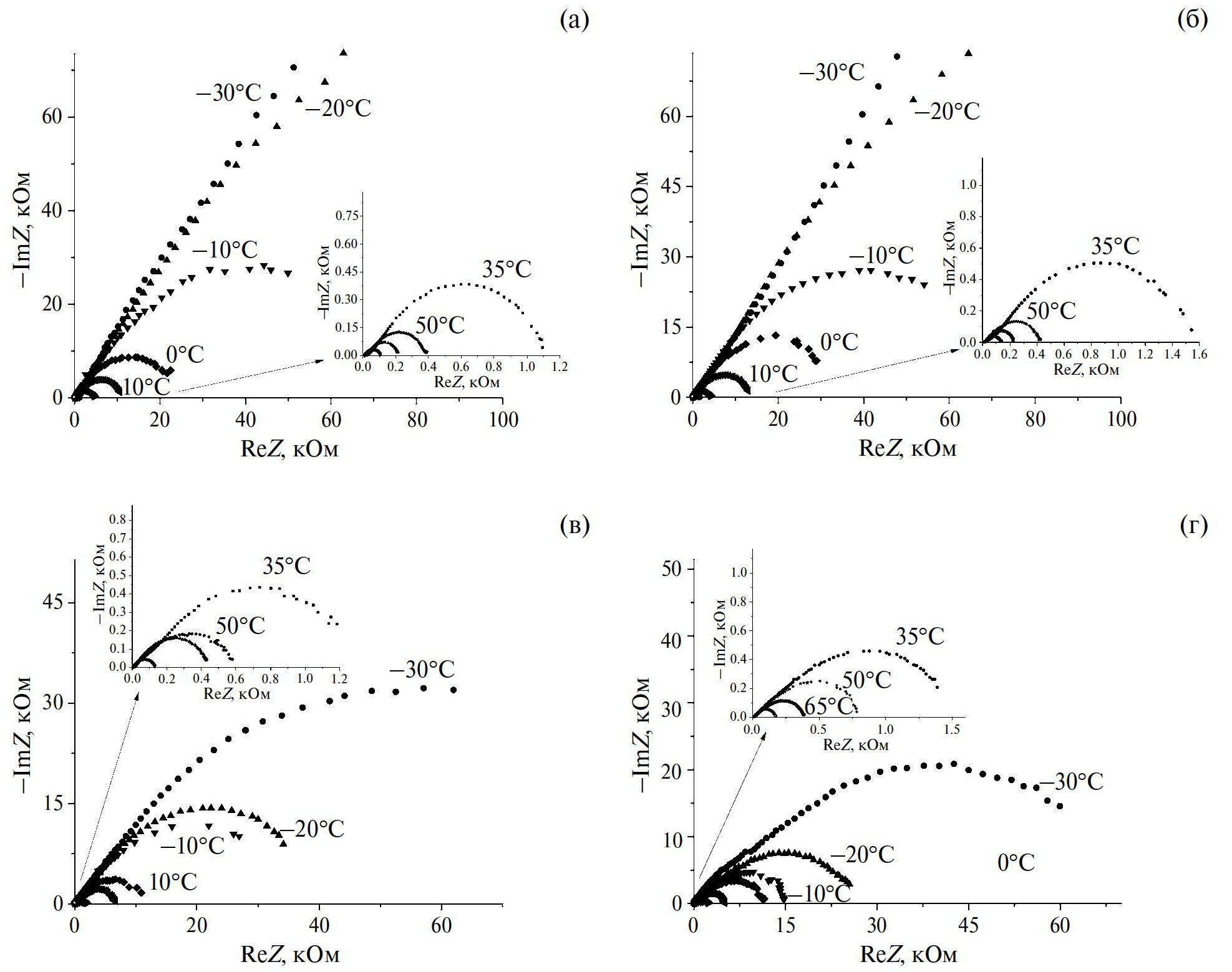 Из рис. 2 видно, что для ячеек с жидкофазной обработкой годограф при –30°C аналогичен годографам ячеек с ПЭ и НПЭ при –10°C. Таким образом, можно сказать, что присутствие жидкого электролита увеличивает область рабочих температур до –30°C. В высокотемпературном интервале 35, 50, 65 и 80°C (рис. 2, врезки) виды годографов импеданса для разных ячеек не отличаются.