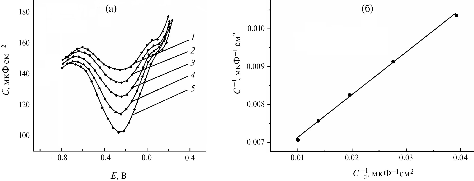 Реализована новая методика обработки емкостных кривых, которая позволила рассчитать зависимость емкости в области пространственного заряда графитового электрода от скачка потенциала. Показано, что в условиях отсутствия специфической адсорбции аниона PF6– , полученная зависимость вполне удовлетворительно описывается в рамках характерной для полупроводниковых материалов модели Мотта–Шоттки. Получены оценки потенциала плоских зон (0.01 В) и концентрации носителей заряда в зоне проводимости (2.3×1019 см–3) исследованного графитового материала.