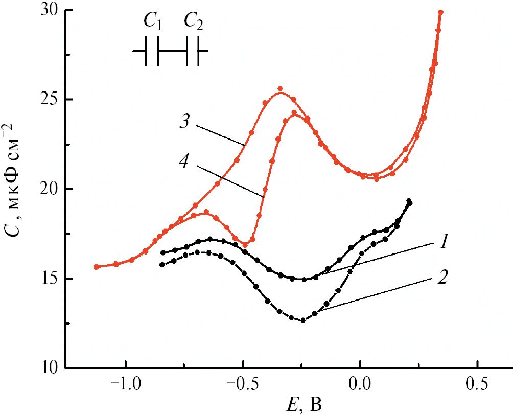 Отметим, что впервые подобные эффекты были зафиксированы в работе Б.Б. Дамаскина (с коллегами из Тартуского университета, Эстония) на Bi-электроде и были качественно интерпретированы в [24] с точки зрения полупроводниковых свойств этого металла. Авторы [24] предположили, что общее падение потенциала на границе раздела Bi с водными растворами KF включает в себя две составляющие, а именно, падение потенциала в приповерхностном слое электрода (слое объемного заряда) и скачок на границе электрода с раствором электролита, т. е. в двойном слое. В этих условиях измеряемая емкость представляет собой суммарную емкость двух последовательно соединенных конденсаторов (см. вставку на рис. 5), характеризующих область объемного заряда (С1) и двойной слой на границе висмута с раствором электролита (С2). Очевидно, что эта суммарная емкость будет меньше емкости ДЭС на границе электрод/электролит.