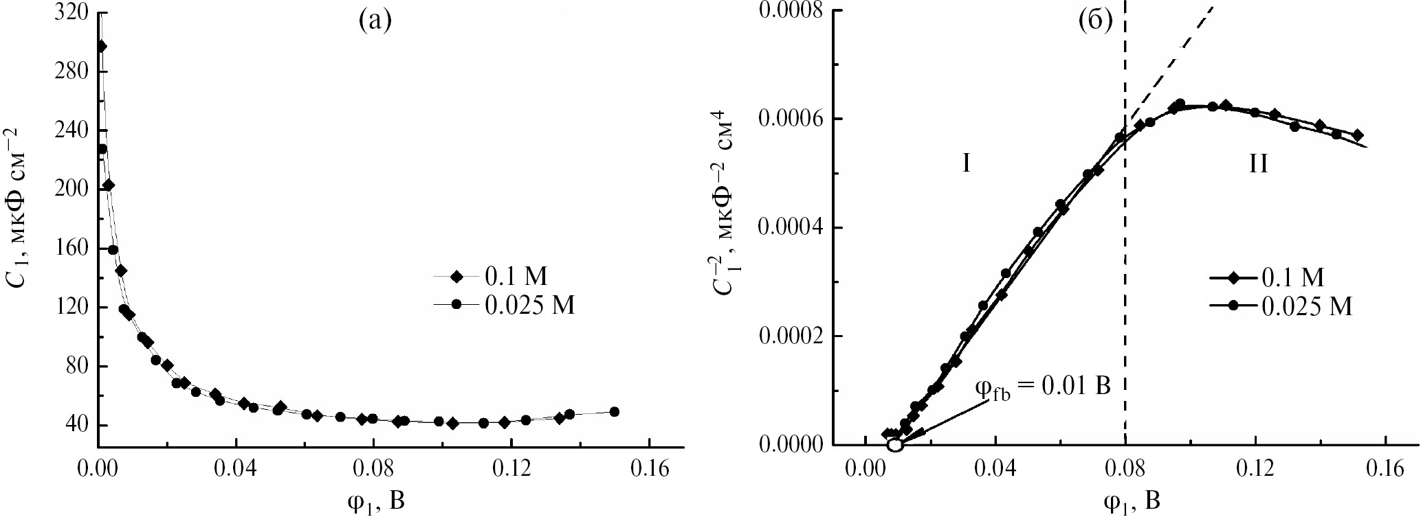 На рис. 8б рассчитанные зависимости C1 от φ1 показаны в координатах Мотта–Шоттки, т. е. C1–2 – φ1 [39]. Условно, по характеру этих зависимостей, можно выделить следующие две области потенциалов (обозначены I и II на рис. 8б). Область I характеризуется наличием интервала потенциалов, в котором величина C1–2 является линейной функцией φ1. Исходя из параметров этой прямой линии, можно получить важные характеристики полупроводникового материала, используемого в качестве электрода. Так, точка пересечения этой линии с абсциссой дает потенциал плоских зон φfb, который составляет ~0.01 В, а концентрация носителей заряда в зоне проводимости N, рассчитанная из тангенса угла наклона этой линии b по соотношению: