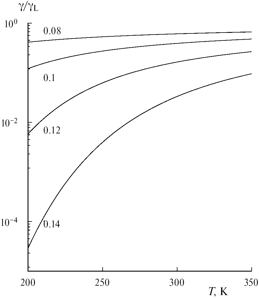 3. Fig. 2. Dependence of the ratio γ/γL on l for the attractive additional interaction and the exponential correlation function c(r) = exp(–r/l) for different values ​​of T, K: 150, 200, 250, 300 and 350 from the lower curve to the upper one, respectively; R = 1 nm, σ = 0.1 eV and ε = 3.