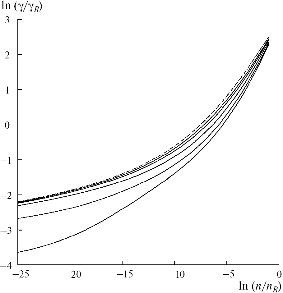 Рис. 3. Зависимость отношения γ/γR от концентрации носителей n/nR для двумерной рекомбинации с отталкивающим дополнительным взаимодействием и дипольной корреляционной функцией c(r) = 0.76a/r с a = 1 нм для различных значений σ, эВ: 0.05, 0.07, 0.1, 0.13 и 0.15; T = 300 К, R = 1 нм, ε = 3, γR = 2πD. Пунктирная линия с точками соответствует случаю отсутствия беспорядка. Линии, расположенные ближе к этой линии разделения, соответствуют меньшим значениям σ.