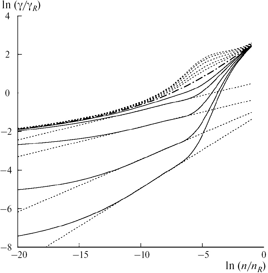 Рис. 4. Зависимость отношения γ/γR от концентрации носителей n/nR для двумерной рекомбинации с притягивающим (штриховые линии) и отталкивающим (сплошные линии) дополнительным взаимодействием и экспоненциальной корреляционной функцией c(r) = exp(–r/l) с l = 5 нм для различных значений σ, эВ: 0.05, 0.07, 0.1, 0.13 и 0.15;T = 300 К, R = 1 нм, ε = 3. Пунктирная линия с точками показывает случай отсутствия беспорядка. Линии, расположенные ближе к этой линии разделения, соответствуют меньшим значениям σ. Пунктирные прямые линии показывают область, где γ ns.