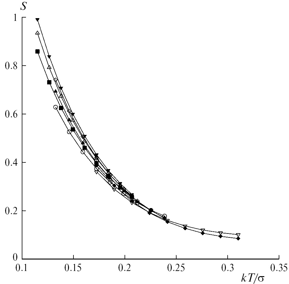 6. Fig. 5. Dependence of the exponent s in the ratio γ ∝ ns on kT/σ at q = –1 and c(r) = exp(–r/l). Different curves are shown for l equal to 5 nm, 7 nm, and 10 nm (we use different symbols for different combinations of l and σ, but all the curves are quite close to each other, so we do not give more precise notations for individual curves). For smaller and larger l, the linear region in Fig. 4 is not sufficiently developed.