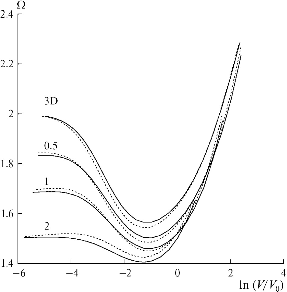 Рис. 7. Зависимость логарифмической производной Ω = d(ln J )/d(ln V ) от lnV для различных значений s, указанных рядом с соответствующей кривой, K = 1 и Gs = 1; верхняя кривая – кривая трехмерной рекомбинации. Сплошные линии показывают зависимость для µ+ = µ, пунктирные линии – зависимость для µ+ = 2µ.