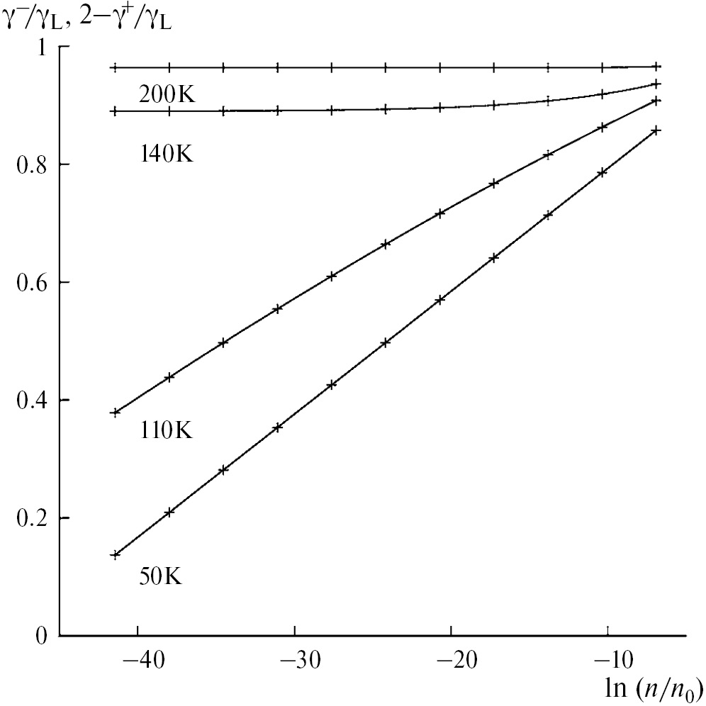 9. Fig. 8. Dependence of γ–/γL (crosses) and 2-γ+/γL (lines) on the charge carrier concentration for different temperatures (indicated near the curves) for the exponential density of states with E0 = 0.01 eV and the dipole correlation function with r0 = 1 nm.