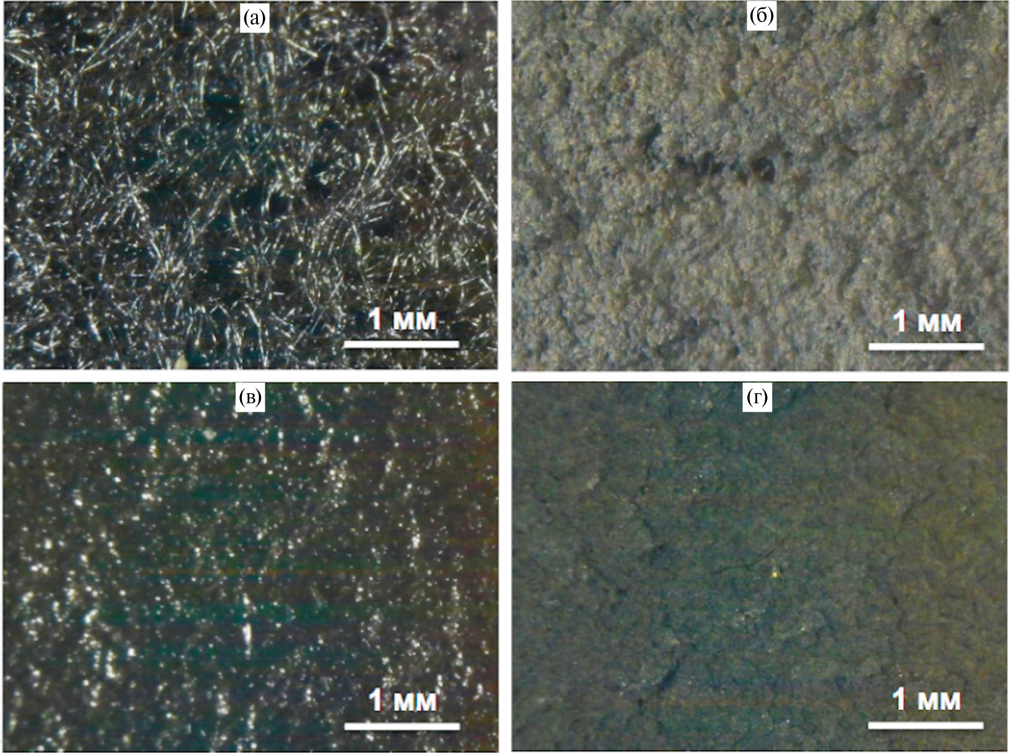 Рис. 2. Фото поверхности образцов FBE-0 (а), FBE-2 (б), FBE-7.5 (в) и FBE-20 (г).