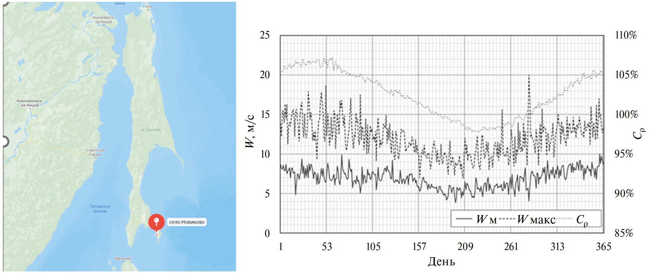 В качестве примера для расчета системы автономного энергоснабжения на основе ветрогенераторов и водородного аккумулирования энергии выбран реальный объект с. Новиково на о. Сахалин. Село расположено в 74 км от города Корсаков и в 130 км от города Южно-Сахалинск в южном направлении (рис. 4а). Население составляет 550 человек и занятно в транспортной сфере, сфере услуг, в энергетике и рыбном промысле. По существующей схеме энергоснабжения село Новиково обеспечивается электроэнергией и теплом от энергоузла, не подключенного к общей энергосистеме острова Сахалин. Электроэнергия вырабатывается дизельной электростанцией (ДЭС). Себестоимость производимой электрической и тепловой энергии высока в связи с высокой стоимостью привозного закупаемого дизельного топлива.