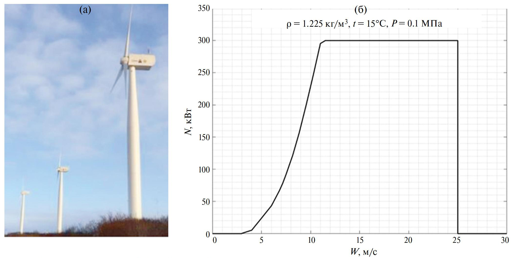 Для расчета альтернативной схемы энергоснабжения выбран ветрогенератор KWT-300 (KOMAI HALTEC Inc.), разработанный специально для эксплуатации в суровых климатических условиях (рис. 5а). Его кривая мощности представлена на рис. 5б.