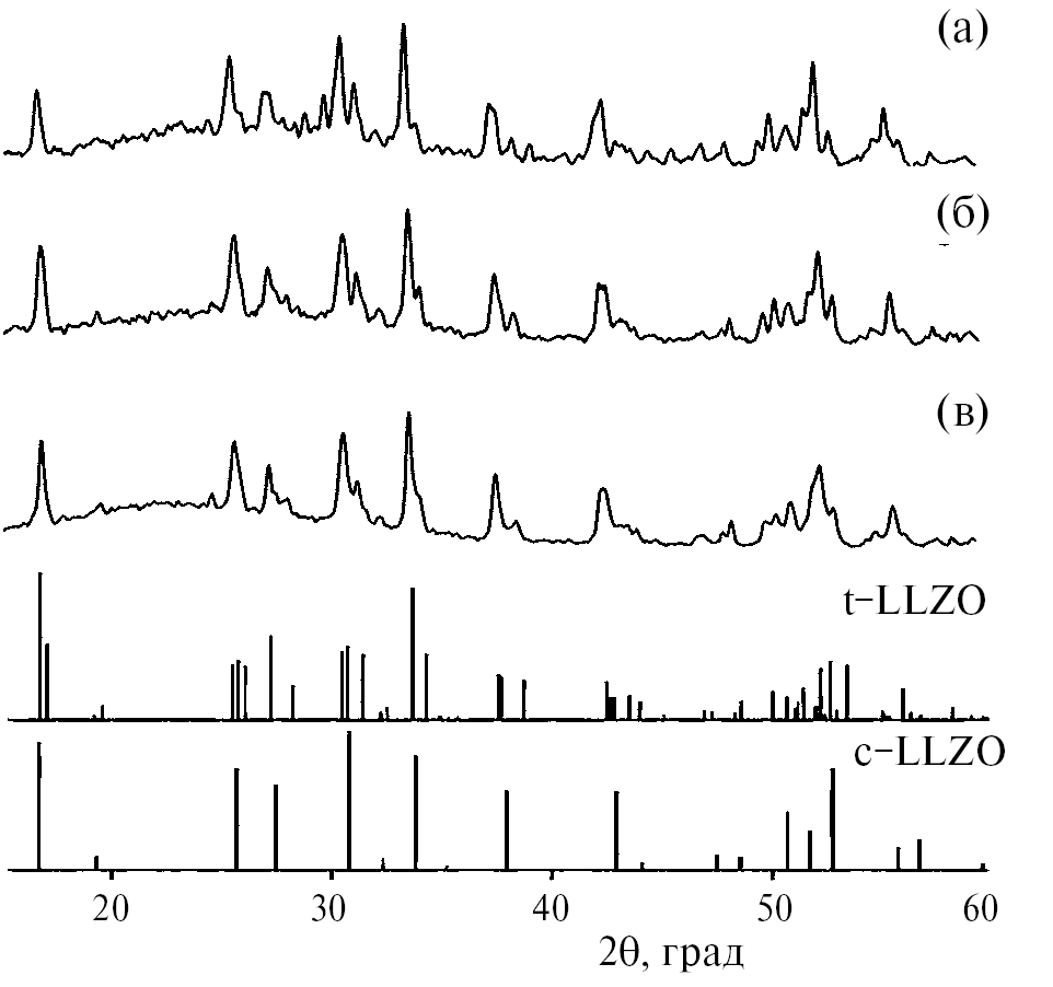 По результатам РФА установлено (рис. 1а), что после 1-й стадии синтеза Al–LLZO в результате отжига при 900°C в течение 4 ч происходило образование продукта со структурой граната, не содержащего исходных непрореагировавших веществ и непроводящих примесных фаз (La2O3, ZrO2, La2Zr2O7). Образцы представляют собой хорошо окристаллизованные порошки индивидуального Al–LLZO в виде смеси 2 модификаций: тетрагональной (ICDD PDF 01–080–6140) и кубической (ICDD PDF 01–080–7219) в соизмеримых количествах. Повышение температуры (до 1100°C) и продолжительности отжига порошков (до 6 ч) не обеспечивало получение чистой кубической модификации Al–LLZO, на рентгенограмме также присутствовала смесь тетрагональной и кубической модификации (рис. 1б).
