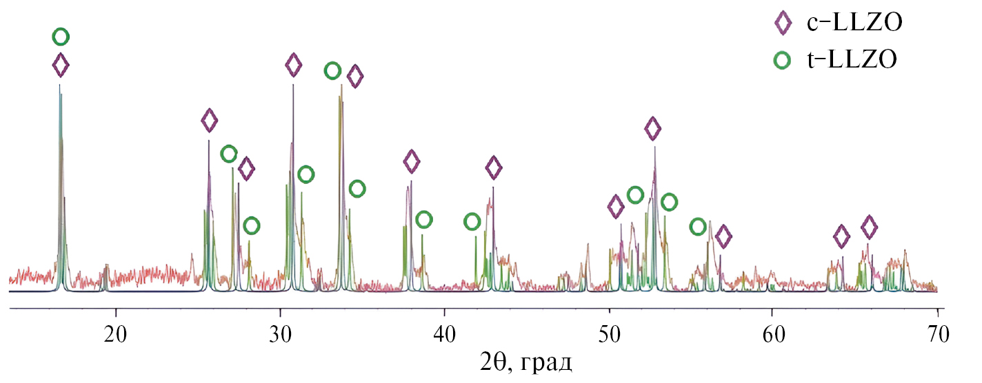 Для консолидации методом ИПС первоначально использовали порошки Al–LLZO, полученные после отжига при 900°С. По данным РФА, при различных режимах ИПС (температура спекания 900–1000°C, давление прессования 50 МПа, продолжительность спекания 5–10 мин) были получены таблетки Al–LLZO также в виде смеси 2 модификаций (рис. 2). В этой связи ионная проводимость, измеренная методом спектроскопии электрохимического импеданса, была незначительной (находилась на уровне 1×10–5 См/см). По-видимому, кратковременный процесс ИПС не обеспечивает полную трансформацию низкопроводящей тетрагональной модификации Al–LLZO в кубическую. При использовании тетрагональной модификации авторам [21] потребовалась дополнительная термообработка в течение 12 ч при 1175°C образцов LLZO, подвергнутых ИПС, поскольку общая ионная проводимость образцов LLZO после ИПС составляла лишь 7×10–6 См/см.