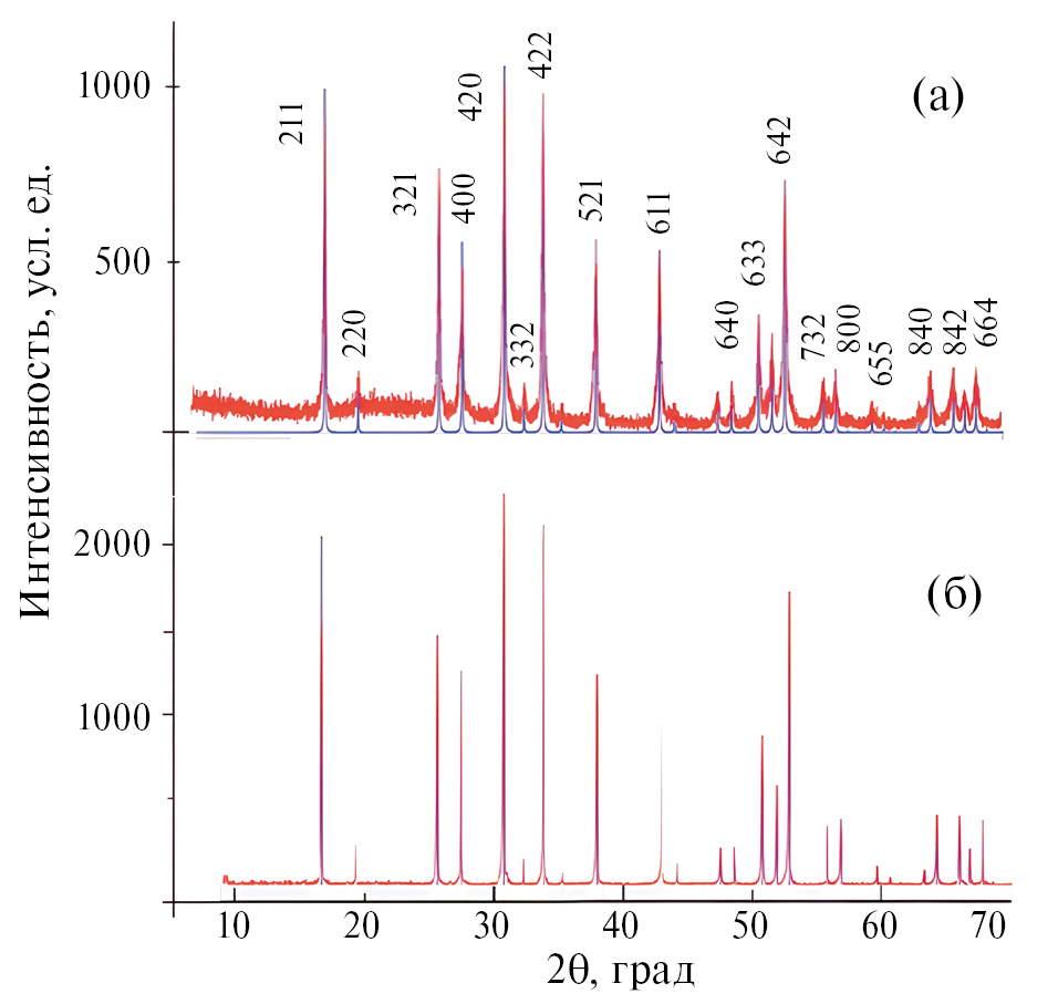 Рис. 3. Дифрактограммы механоактивированного порошка Al–LLZO кубической модификации (а) после отжига при 1000°C и (б), подвергнутого ИПС.