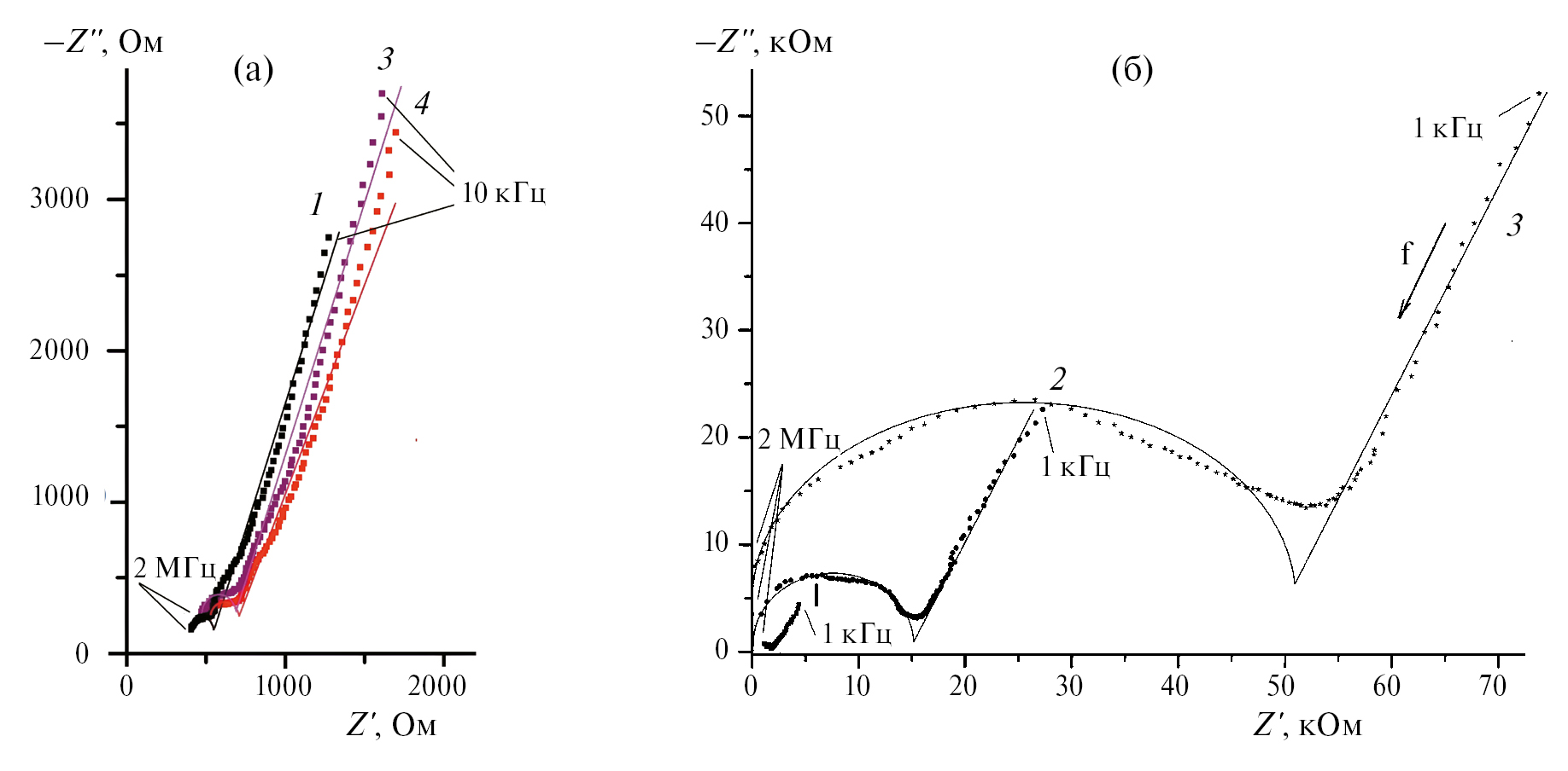 Рис. 5. Годографы импеданса образцов Ta–LLZO после ИПС (а) и после твердофазного спекания (б). 1 – измерены непосредственно после синтеза, 2 – спустя 10 дней, 3 – спустя 1 мес., 4 – спустя 2 мес. хранения на воздухе.