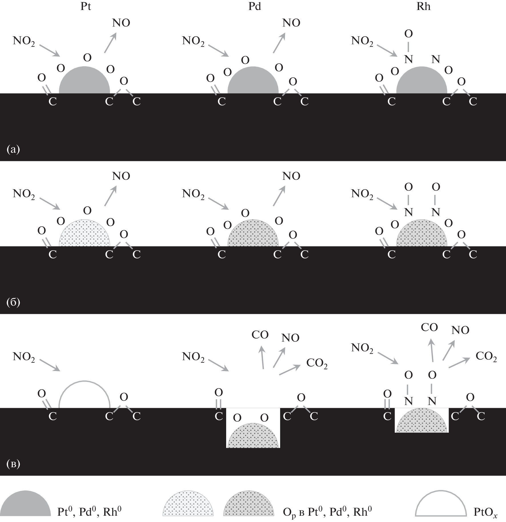 This paper presents a review of the results obtained in studying the room temperature interaction of NO2 with model systems prepared by vacuum deposition of platinum group metals on the surface of highly oriented pyrolytic graphite (M/HOPG, M = Pt, Pd, Rh) at pressure of 10–6–10–4 mbar. Particular attention was focused on establishing the chemical state of the supported metal particles and carbon support using X-ray photoelectron spectroscopy (XPS). Before treatment in NO2, M/HOPG samples were characterized by scanning tunneling and/or scanning electron microscopy (STM and SEM). Upon interaction with NO2, supported palladium and rhodium remained in the metallic state and, at the same time, exhibited catalytic activity in the oxidation of graphite. The process was accompanied by the destruction of ≥10–15 graphene layers with the penetration of metal particles deep into the carbon support. Rhodium was less active in the oxidation of graphite compared to palladium due to the filling of its surface with NO molecules arising from the dissociation of NO2. When the samples with deposited platinum were treated in NO2, the carbon support underwent minimal changes without disturbing its original structure. Platinum retained its metallic state when deposited on the surface of graphite annealed in vacuum and was oxidized to PtO and PtO2 oxides on the surface activated by etching with argon ions. Based on the results obtained, a mechanism was proposed for the room temperature interaction of M/HOPG systems with NO2.