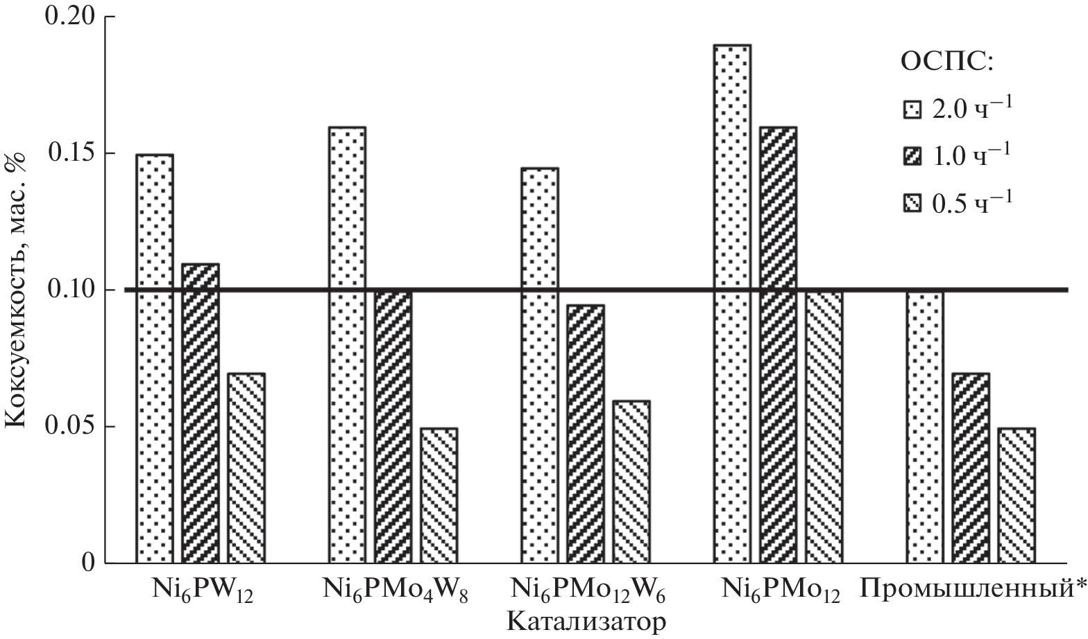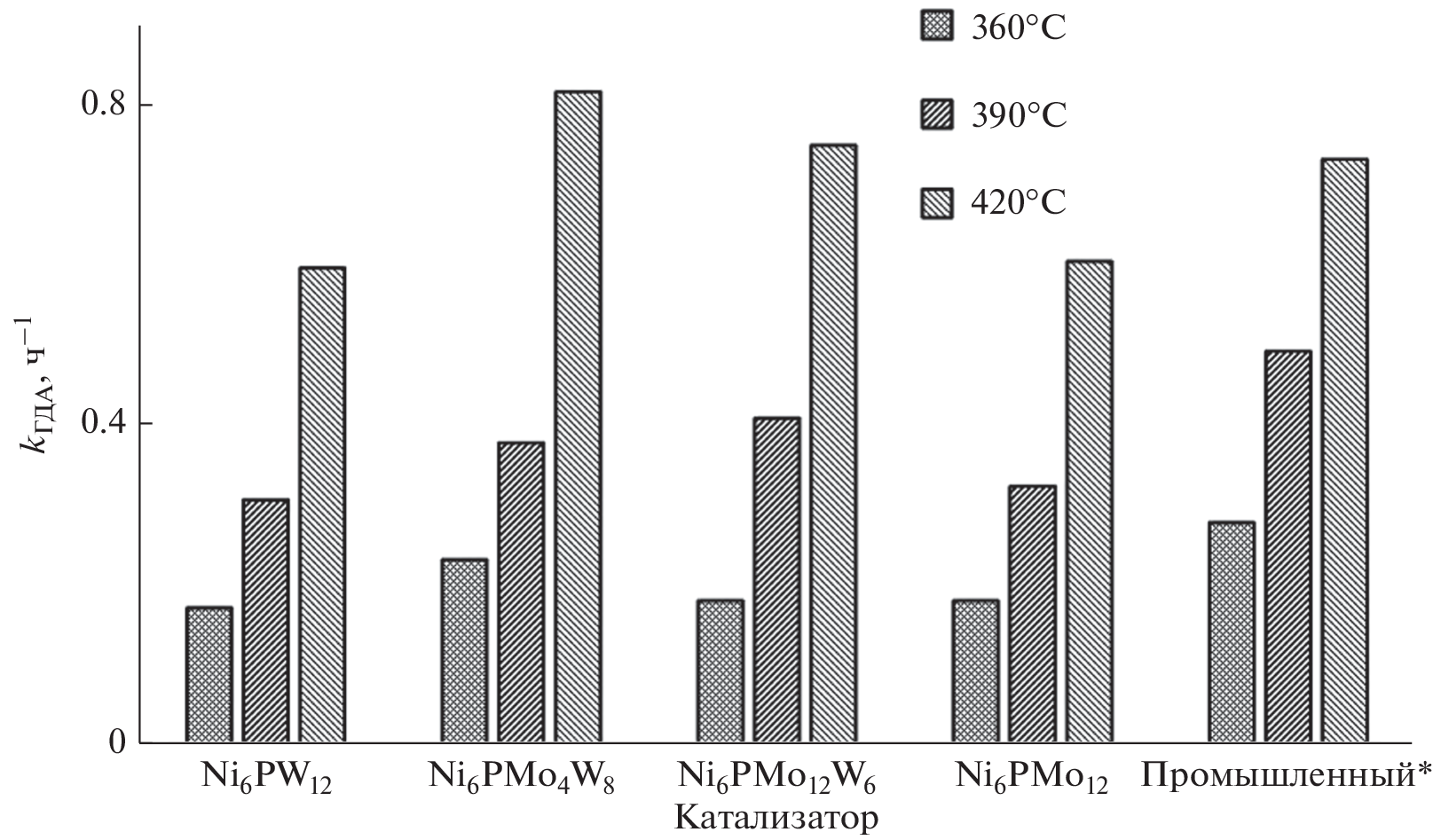 Kinetic studies of hydrodesulfurization and hydrodenitrogenation reactions were carried out, as well as a comparison of the hydrogenating activity of the synthesized Ni6PMonW(12 – n)/Al2O3 catalysts and an industrial reference catalyst in the process of hydrotreating of heavy mixed oil feedstock. As it was shown, the HDS reaction is described by a pseudosecond order equation, while the HDN reaction is described by a pseudofirst order. The obtained hydrogenates meet the requirements for the quality of feedstock of catalytic cracking plants in terms of coking capacity, sulfur and nitrogen content.