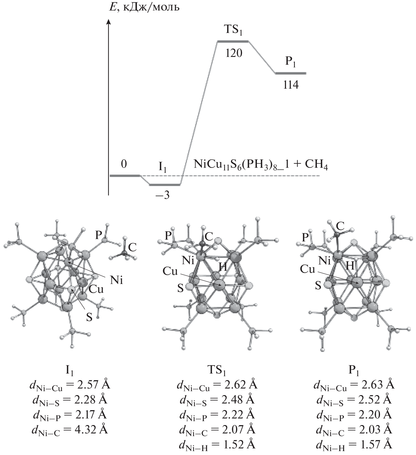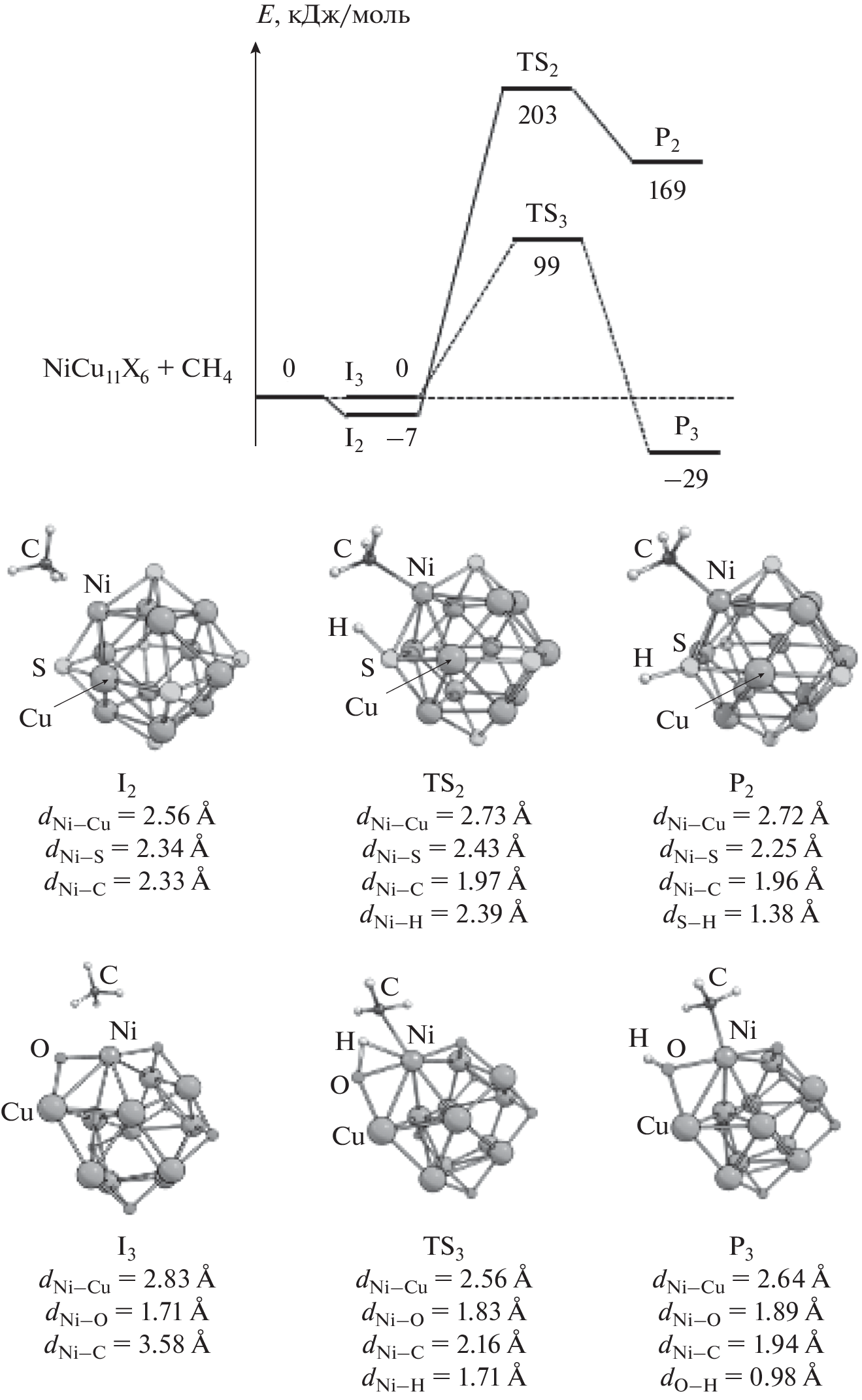 Методом функционала плотности PBE проведено моделирование разрыва связи С–Н в метане на Ni–Cu-кластерах, обогащенных медью, как первой стадии каталитической углекислотной конверсии метана. В качестве моделей катализаторов рассмотрены наноразмерные кластеры NiCu11S6(PH3)8, NiCu11S6, NiCu11O6(PH3)8, NiCu11O6. Рассчитана энергия связи метана с кластерами и определена энергия активация стадии \({\text{CH}}_{4}^{*}\) → \({\text{CH}}_{3}^{*}\) + H*. На основании полученных данных установлено, что каталитическая система NiCu11O6 является наиболее перспективной для активации CH4 как в кинетическом (энергия активации равна 99 кДж/моль), так и в термодинамическом отношении (изменение энергии стадии равно –29 кДж/моль). С целью оценки стабильности кластера NiCu11O6 к зауглероживанию проведено моделирование адсорбции CH с последующей диссоциацией (CH* → C* + H*). Рассчитанное значение энергии активации данной стадии достаточно высокое, 159 кДж/моль.