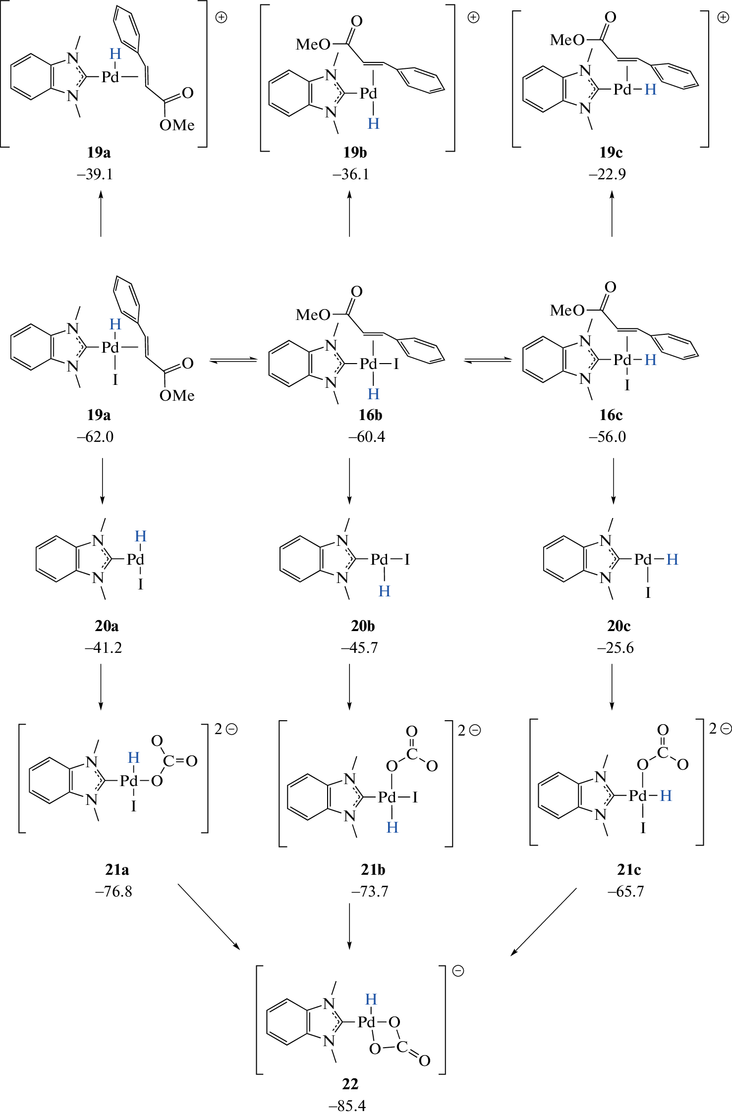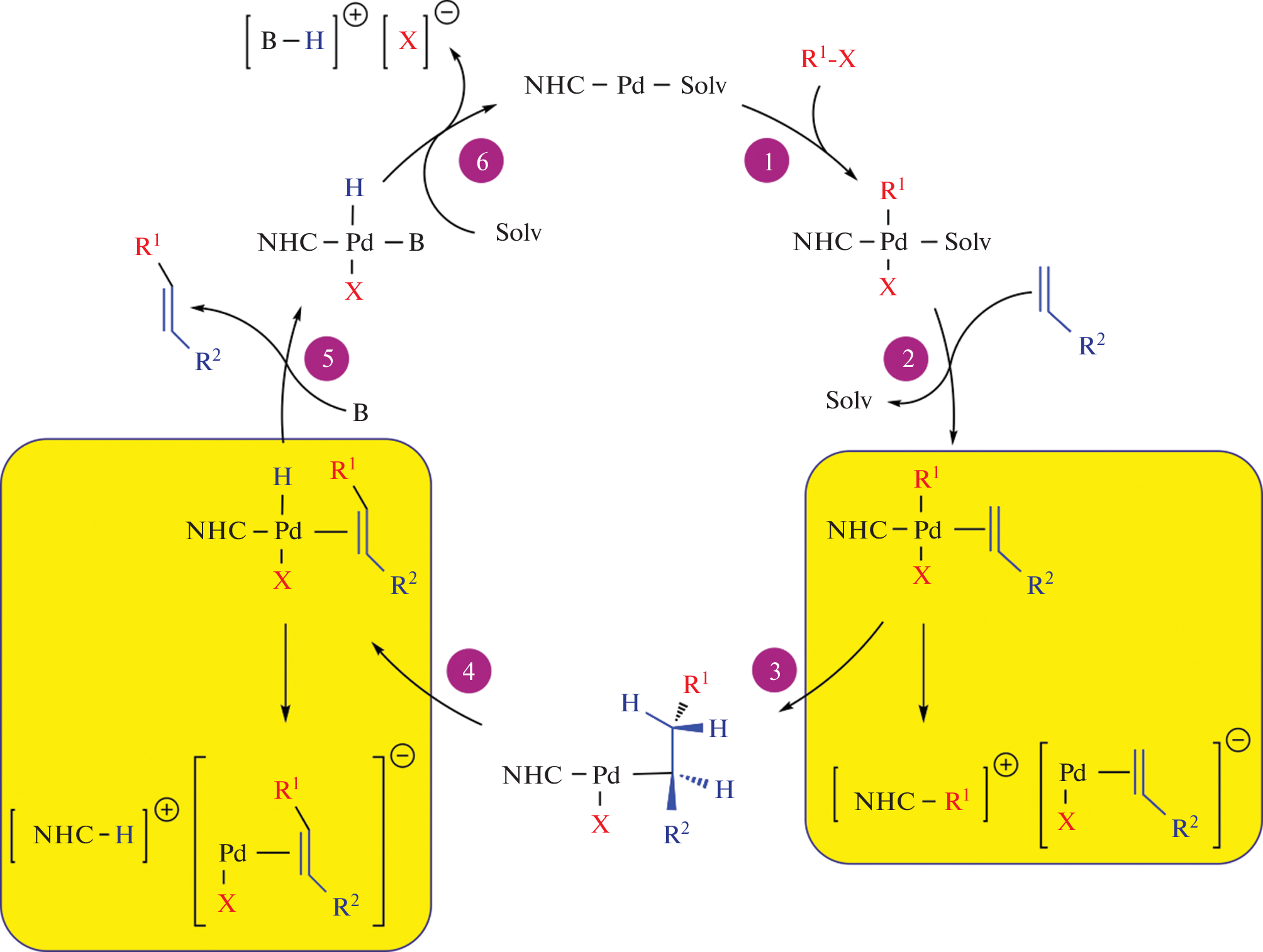 The mechanism of the formation of catalytic species in the practically important Mizoroki–Heck reaction, which is in demand in modern fine organic synthesis, has been studied. It has been shown that catalysts based on palladium complexes with N-heterocyclic carbene ligands are transformed into a “ligand-free” form under the conditions of the Mizoroki–Heck reaction. Molecular modeling performed using quantum chemical methods showed that these processes compete with the target reaction at three of the six stages of the catalytic cycle. The presence of catalyst transformation products in the reaction system was confirmed by methods of nuclear magnetic resonance and mass spectrometry. Important mechanistic data have been obtained for the rational design of catalytic systems for cross-coupling reactions.