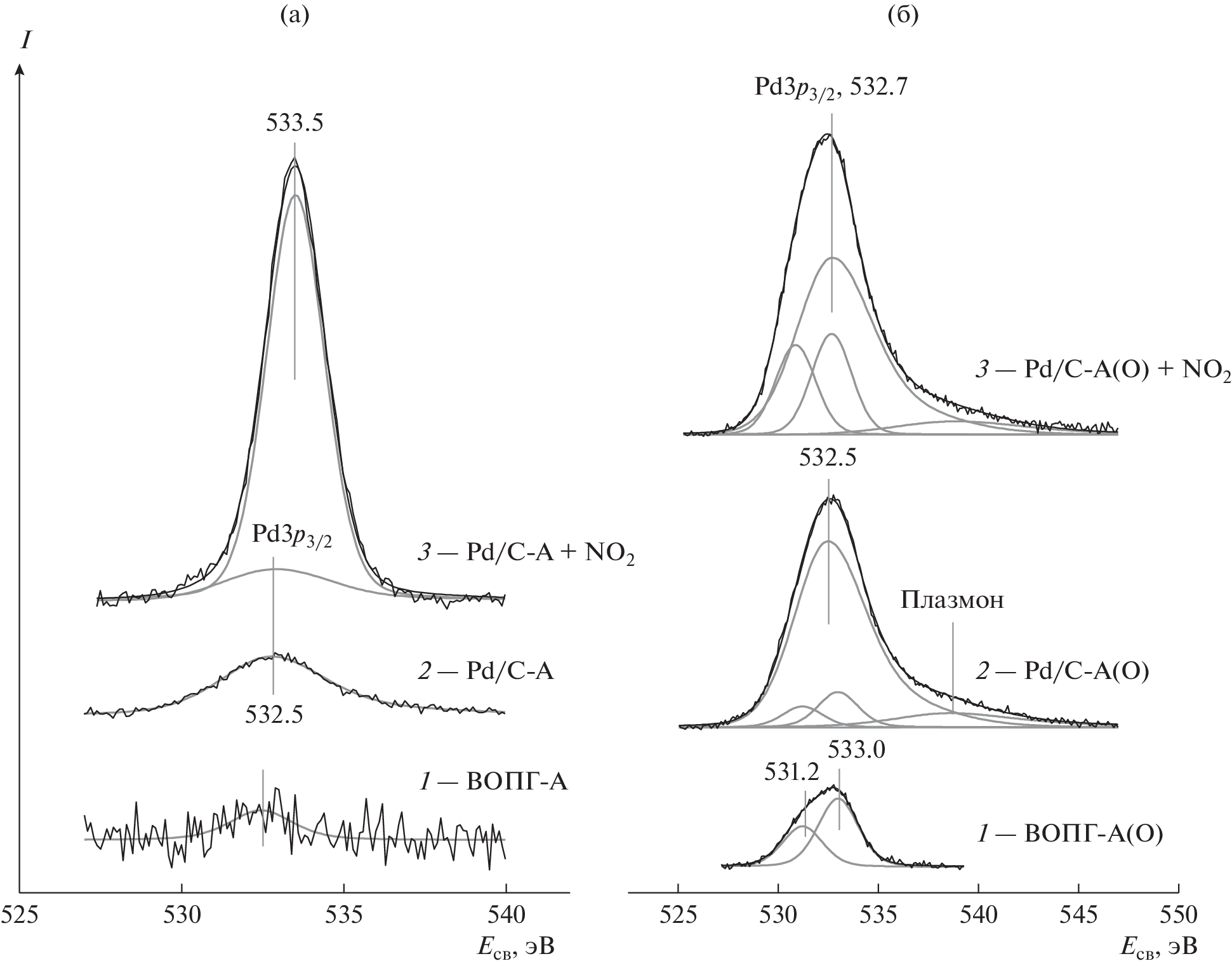 X-ray photoelectron spectroscopy (XPS) method has been used to study the effect of oxygen on the surface of a carbon support on the result of NO2 interaction with model systems prepared by evaporation of palladium on highly oriented pyrolytic graphite (HOPG). For Pd/HOPG samples with an atomic ratio [O]/[C] ≤ 0.0035, graphite oxidized with the destruction of its structure to a depth of 10–15 graphene layers. In this case, palladium particles remained in the metallic state and penetrated into the subsurface layer of the support due to the deep oxidation of the adjacent carbon atoms. At the atomic ratio [O]/[C] ≈ 0.01–0.02, the result of the interaction changed dramatically. In this case, the HOPG remained stable, and the palladium particles were oxidized to form an oxide. This finding explained the high stability of supported palladium catalysts prepared on Sibunit carbon supports in reactions of oxidation catalysis.