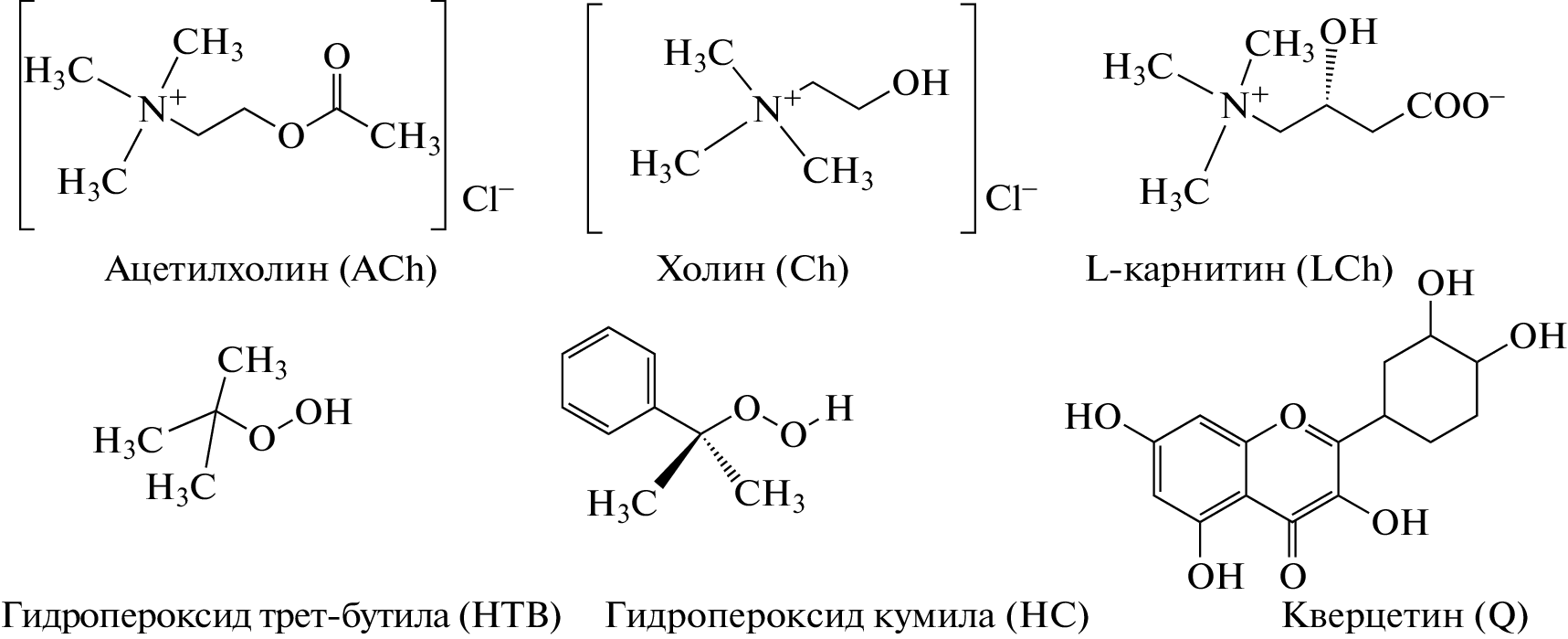 The effect of natural quaternary ammonium compounds (QAC) of choline (Ch) and its derivatives, acetylcholine (AСh) and L-carnitine (LCh), containing the tetraalkylammonium cation (CH3)3RN+, on the radical decomposition of hydroperoxides (ROOH) was studied. In mixtures of ACh and Ch with ROOH in chlorobenzene, mixed supramolecular nanoaggregates are formed, and accelerated decomposition of ROOH into radicals takes place; the rates of radical formation measured by the inhibitor method decrease in the series ACh > Ch \( \gg \) LCh. ACh and Ch immobilized on microcrystalline cellulose retain the ability to catalyze the radical decomposition of ROOH and initiate the polymerization of styrene containing ROOH from the surface. LСh adsorbed on cellulose does not affect the decomposition of ROOH and the rate of polymerization. Scanning electron microscopy (SEM) showed that ACh and Ch adsorbed on a silicon plate accelerate the radical decomposition of ROOH and initiate oxidative condensation of egg phosphatidylcholine on the surface of the plate, while adsorbed LCh does not affect the decomposition of ROOH. LCh, unlike ACh and Ch, is an internal salt in which the R4N+ cation is neutralized by its own carboxy anion, i.e., LCh has no external counterion and, probably, for this reason, it differs from ACh and Ch in the mechanism of adsorption and interaction with ROOH.