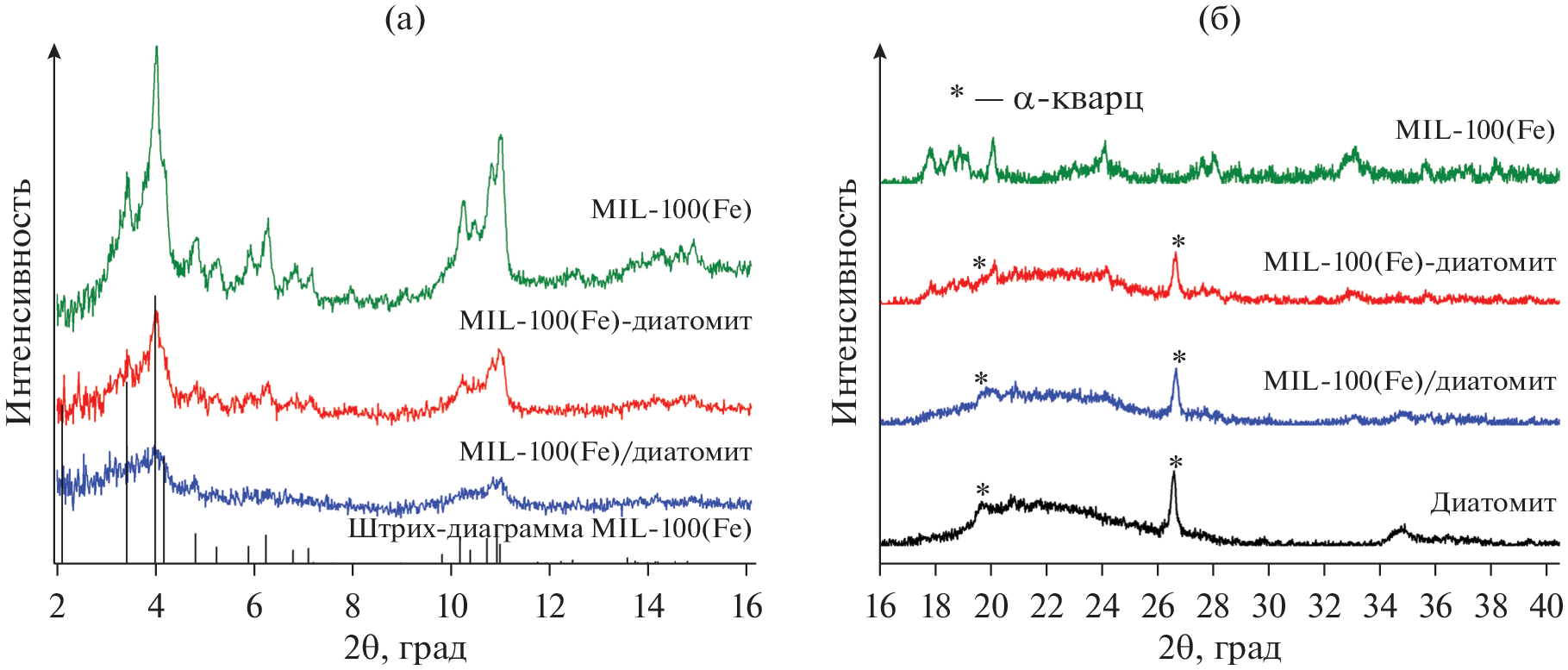 Получены пористые композиты на основе металлорганического каркаса MIL-100(Fe) и природного материала диатомита. Композиты характеризуются удельной поверхностью 322 и 441 м2/г и иерархической пористой структурой, представленной широкими порами исходного диатомита и узкими мезо- и микропорами сформированных частиц MIL-100(Fe). Изучено влияние подхода к синтезу на структуру композитов и каталитические свойства в реакции фотокаталитического разложения фенола. В композите, приготовленном с предварительной пропиткой диатомита раствором нитрата железа, частицы MIL-100(Fe) формируются в основном внутри пор диатомита. Образцы композитов проявляют каталитическую активность в разложении фенола в реакции фото-Фентона. Наибольшей активностью обладает образец, синтезированный без предварительной пропитки диатомита, для которого характерно формирование частиц MIL-100(Fe) преимущественно на внешней поверхности диатомита.