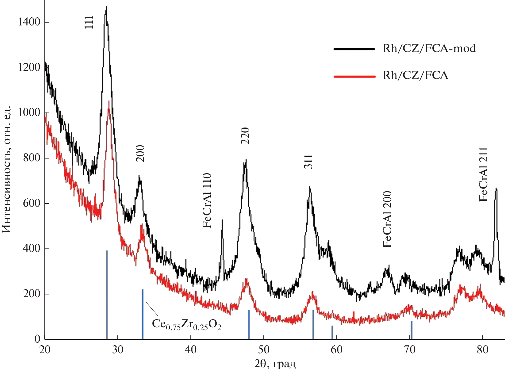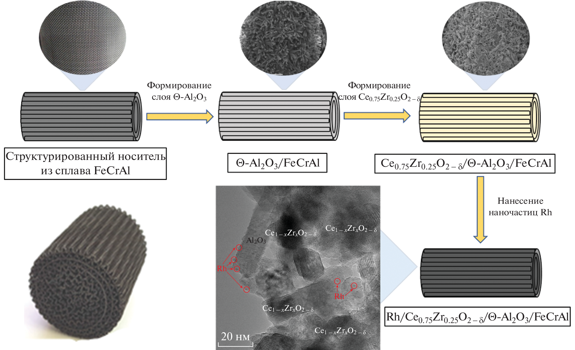 In this work, we improved the technique for depositing the active oxide Ce0.75Zr0.25O2 – δ on a structured FeCrAl alloy substrate. The essence of the method is the coprecipitation of cerium and zirconium oxides on a FeCrAl grid from an aqueous solution of their nitrates Ce(NO3)3·6H2O and ZrO2(NO3)2·7–8H2O during homogeneous hydrolysis with ammonia. It was shown by XRD analysis that in the sample obtained by co-precipitation, more cerium-zirconium oxide phase is formed, moreover, it is more dispersed than obtained by impregnation technique. This method contributes to the formation of a coating with a larger specific surface area. The developed catalyst has a high activity under the conditions of autothermal reforming of diesel fuel. In the course of life tests for 200 h, it was found that the carbonization of the catalyst at a rate of 8.6 mgc \({\text{g}}_{{{\text{cat}}}}^{{ - 1}}\) h–1, as well as the accumulation of sulfur, did not affect the productivity of the catalyst with respect to synthesis gas, which was ~ 8 m3 \({\text{L}}_{{{\text{cat}}}}^{{ - 1}}\) h–1.