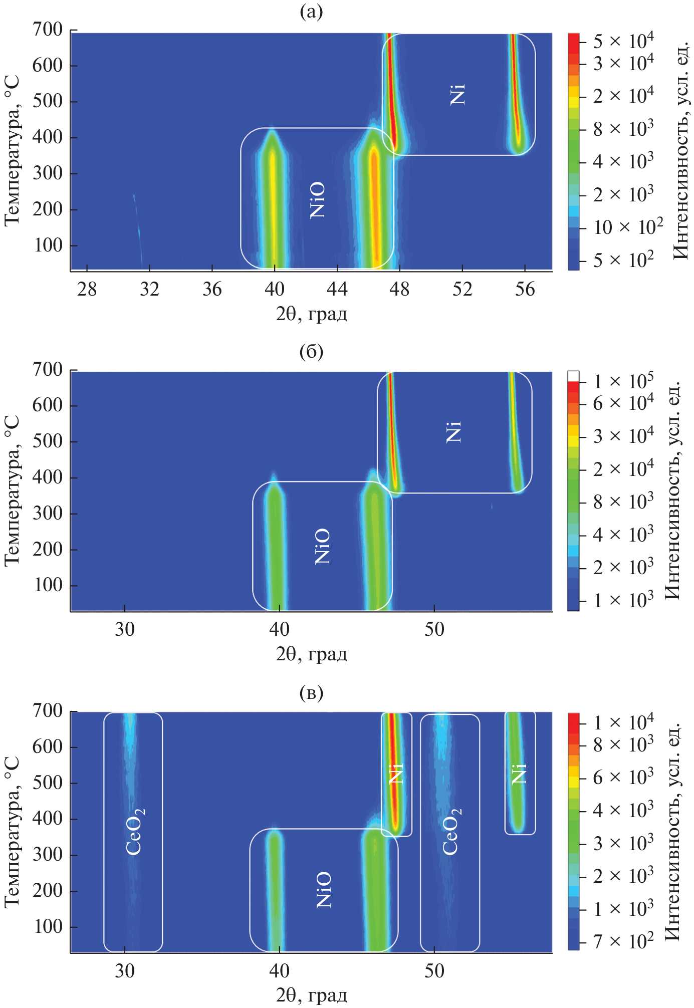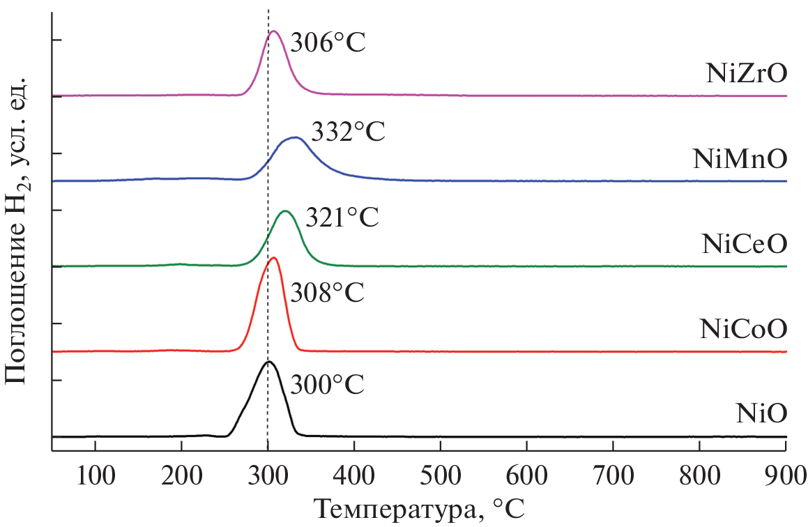In this work the activation process and the effect of modifying additives on the phase composition and structure of a series of catalysts with the general composition Ni0.9M0.1O (M = Co, Ce, Mn, Zr) synthesized by co-precipitation were studied. The influence of the additives on the initial state of the samples was investigated by XRD, and their influence on the NiO reduction process was studied by in situ XRD and TPR-H2. It was shown that the introduced modifiers influence on the structure and microstructure of the initial samples, increasing the value of the specific surface and decreasing the average size of NiO CSR. Introduction of Mn, Co leads to formation with NiO oxide of solid solutions of replacement. For Ce and Zr the release of CeO2 oxide and X-Ray-amorphous ZrOx is observed. The use of these additives leads to an increase in the temperature of NiO reduction to the metallic state compared to the massive oxide. In addition, the effect of modifying additives on the particle size of the final metal is observed. The introduction of Ce and Mn decreases the average size of the NiO CSR in 2–5 times compared to the massive NiO.