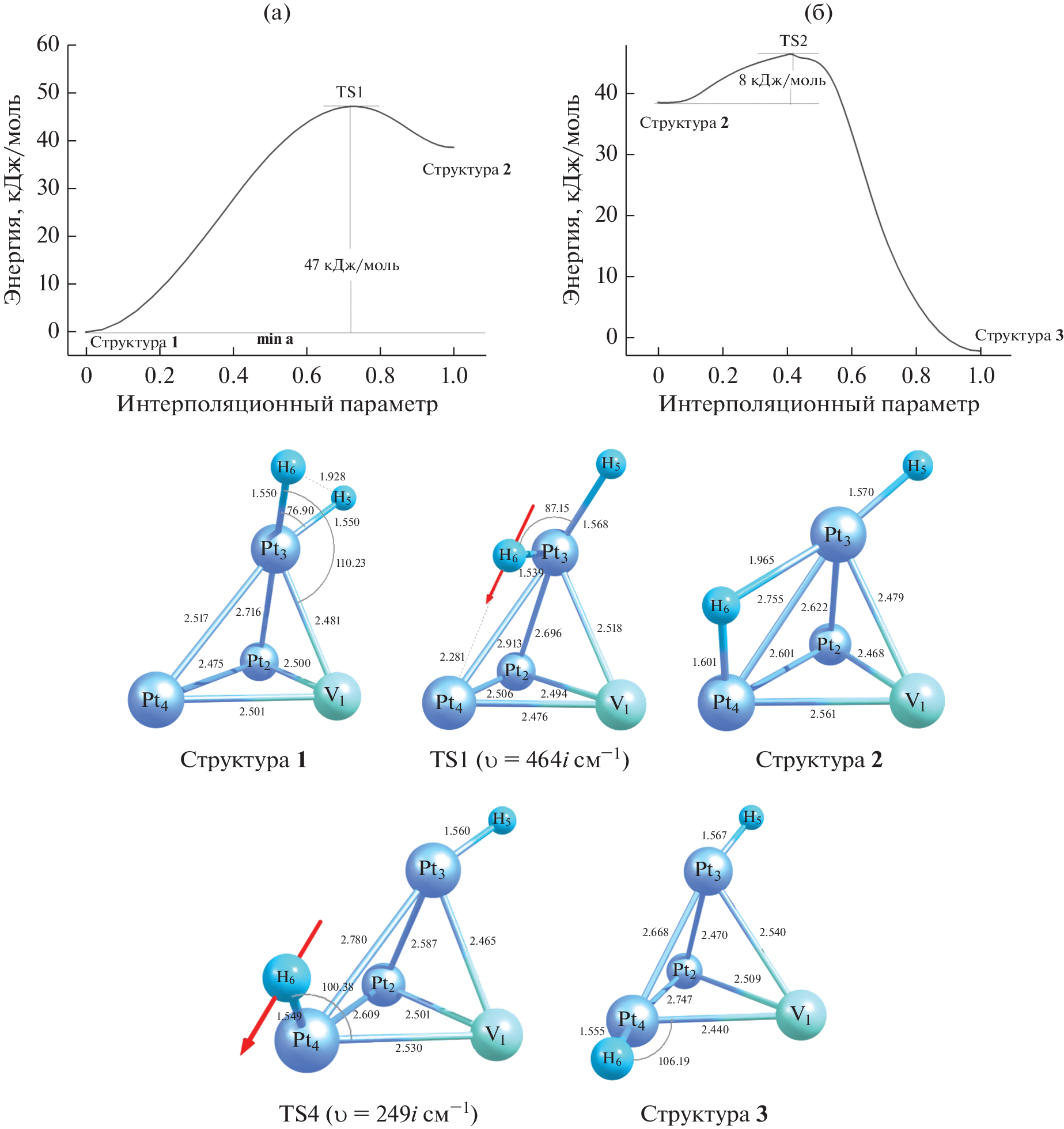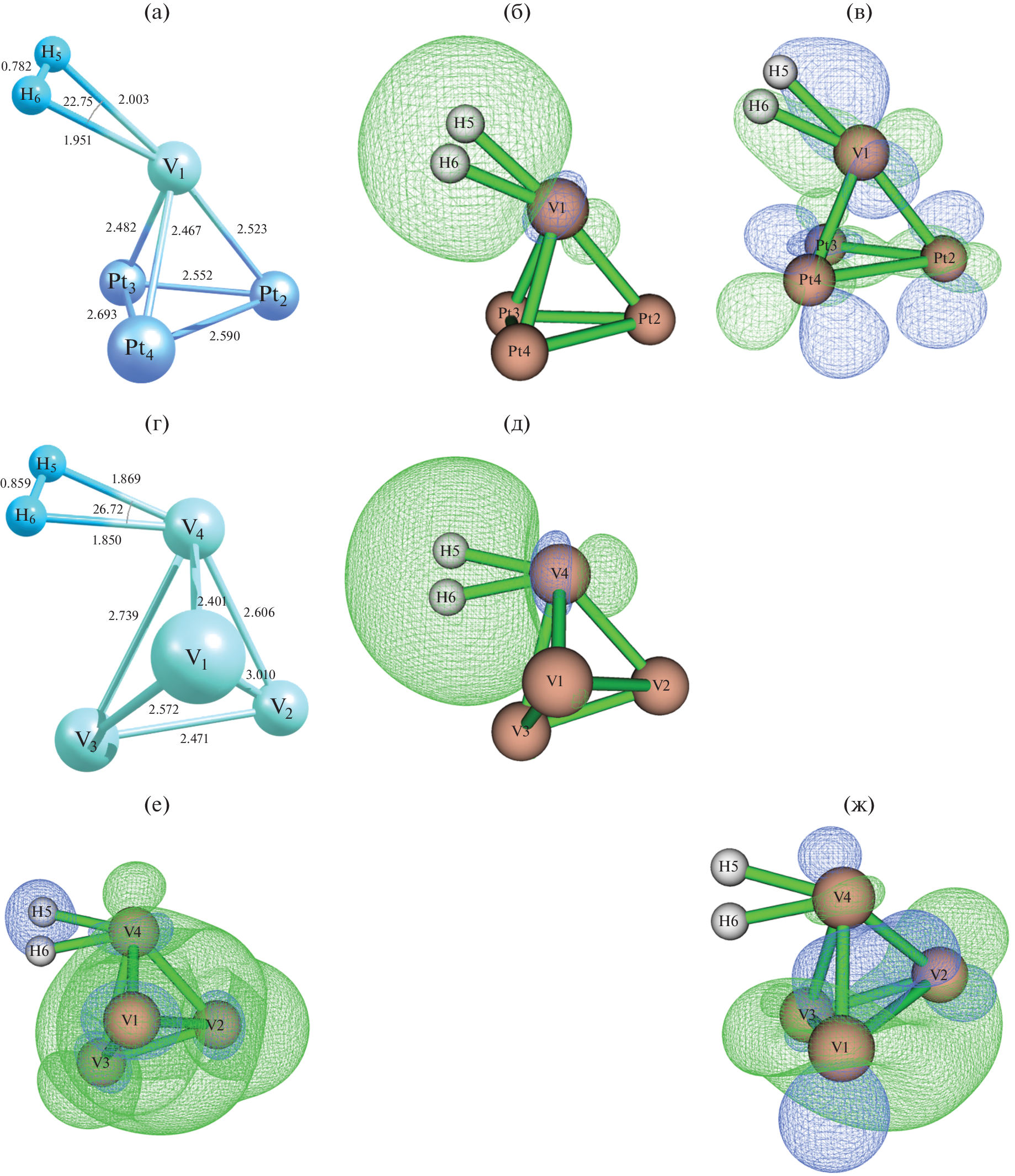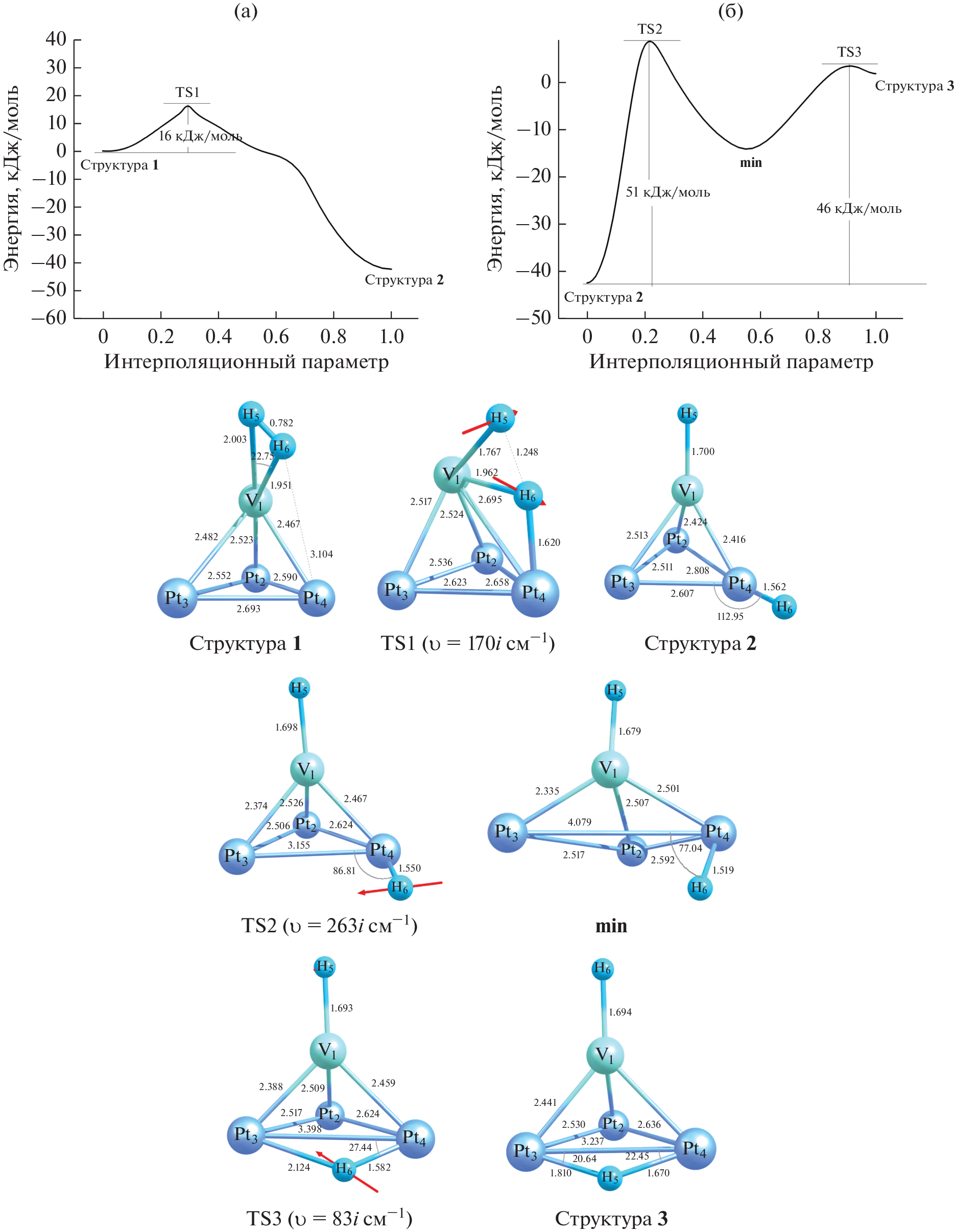 The NEB DFT/PBE0/def2tzvp quantum-chemical method with the construction of minimum energy paths (MEP) was used to study the activation of H2 molecules by Pt4 and Pt3V clusters. It is shown that, in the case of Pt4 and Pt3V clusters, barrier-free dissociative adsorption of H2 molecules occurs on platinum centers, while molecular adsorption of hydrogen occurs on the vanadium atom in Pt3V with a slight weakening of the H–H bond, but without its breaking. The noted features of the coordination of H2 molecules are explained at the level of the MO method. It has been established that the migration of the H atom from one cluster metal center to another in the considered model clusters, as, possibly, in the phenomenon of hydrogen spillover, occurs at small activation barriers in the direction of the displacement vector corresponding to the normal vibration of the system in the transition state. In the process of hydrogen migration, a significant role of Pt–H–Pt and V–H–Pt bridging groups, which facilitate the transition of H atoms from one metal center of the cluster to another, has been revealed.