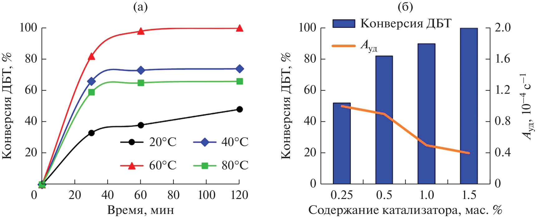 Bimetallic heterogeneous catalysts based on SBA-15 containing molybdenum and iron oxides were studied in the oxidation reactions of model mixtures of organosulfur compounds. Iron additive (in the form of iron(III) oxide) in the amount of 0.05 wt % to the catalyst 5%Mo/SBA-15 turns out to be the most effective. The catalysts were confirmed by a complex of physicochemical methods: low-temperature adsorption-desorption of nitrogen, X-ray phase analysis, transmission electron microscopy, X-ray photoelectron spectroscopy. The influence of the main oxidation parameters (reaction time, temperature, composition and amount of catalyst, amount of oxidizer) on the conversion of dibenzothiophene as a component of the model mixture weas investigated. Optimal oxidation conditions that allow to achieve total transformation of the substrate were selected: H2O2 : S = 2 : 1, 0.5 wt % of the catalyst FeMo/SBA-15, 60 min, 60°C; catalysts can be used for at least 5 cycles without loss of activity during their intermediate washing from oxidation products.