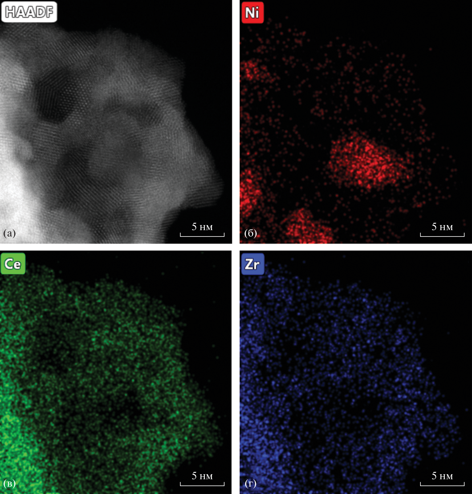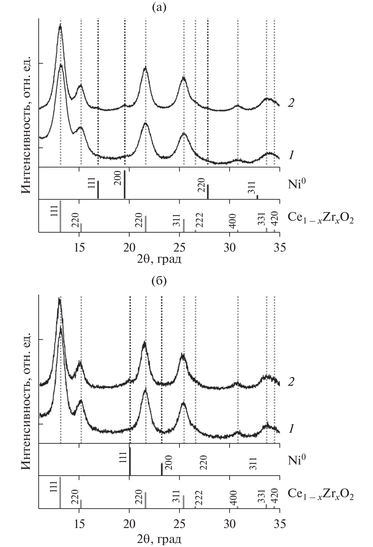 Nickel-based Ni–Ce1 – xZrxO2 catalysts were prepared by Pechini method and their catalytic performance towards CO2 methanation reaction was studied. It was shown that the catalysts exhibit high catalytic activity comparable to the activity of industrial methanation catalyst NIAP-07-05. The catalysts were characterized using a complex of X-ray diffraction methods with experiments on synchrotron radiation, high-resolution electron microscopy, Raman spectroscopy, and X-ray photoelectron spectroscopy. It is shown that the preparation method makes it possible to achieve a high dispersion of nickel-containing particles formed during the decomposition of the Ni–Ce–Zr–O substitutional solid solution obtained during the synthesis. However, due to the decorating effect, the surface of nickel-containing particles is poorly accessible to reagents. For this reason, the Ni–Ce1 – xZrxO2 catalysts obtained by the Pechini method are less active than the supported Ni/Ce1 – xZrxO2 catalysts.