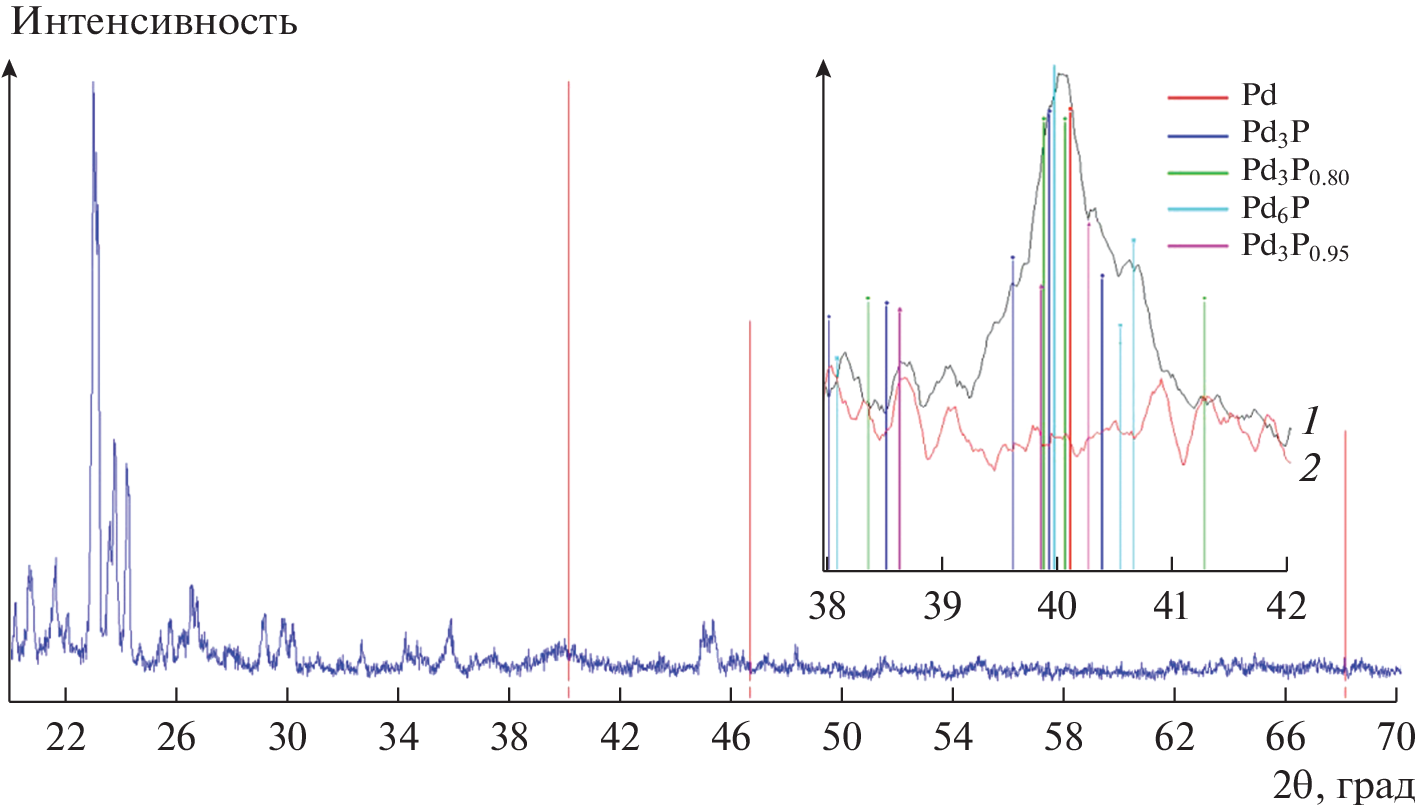 The main reasons for the promoting effect of phosphorus on the properties of Pd–P/ZSM-5 palladium catalysts in the direct synthesis of H2O2 from H2 and O2 under mild conditions are considered based on data from X-ray photoelectron spectroscopy (XPS), X-ray powder diffraction (XRD), high-resolution transmission electron microscopy (HRTEM), and inductively coupled plasma mass spectrometry (ICP MS). It is shown that the introduction of phosphorus into the composition of the catalyst affects the dispersity, the electronic state of palladium in the surface layer, and the surface concentration of phosphate and phosphite ions. An increase in the H2O2 yield is favored by an increase in the dispersion of Pd–P-catalysts, inhibition of the side process of H2O2 decomposition by surface phosphate and phosphite ions, and a decrease in the solubility of hydrogen in solid solutions of phosphorus in palladium.