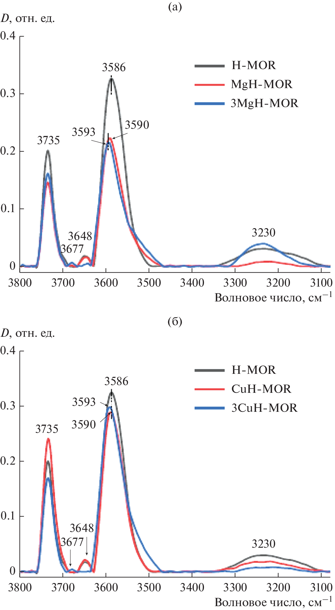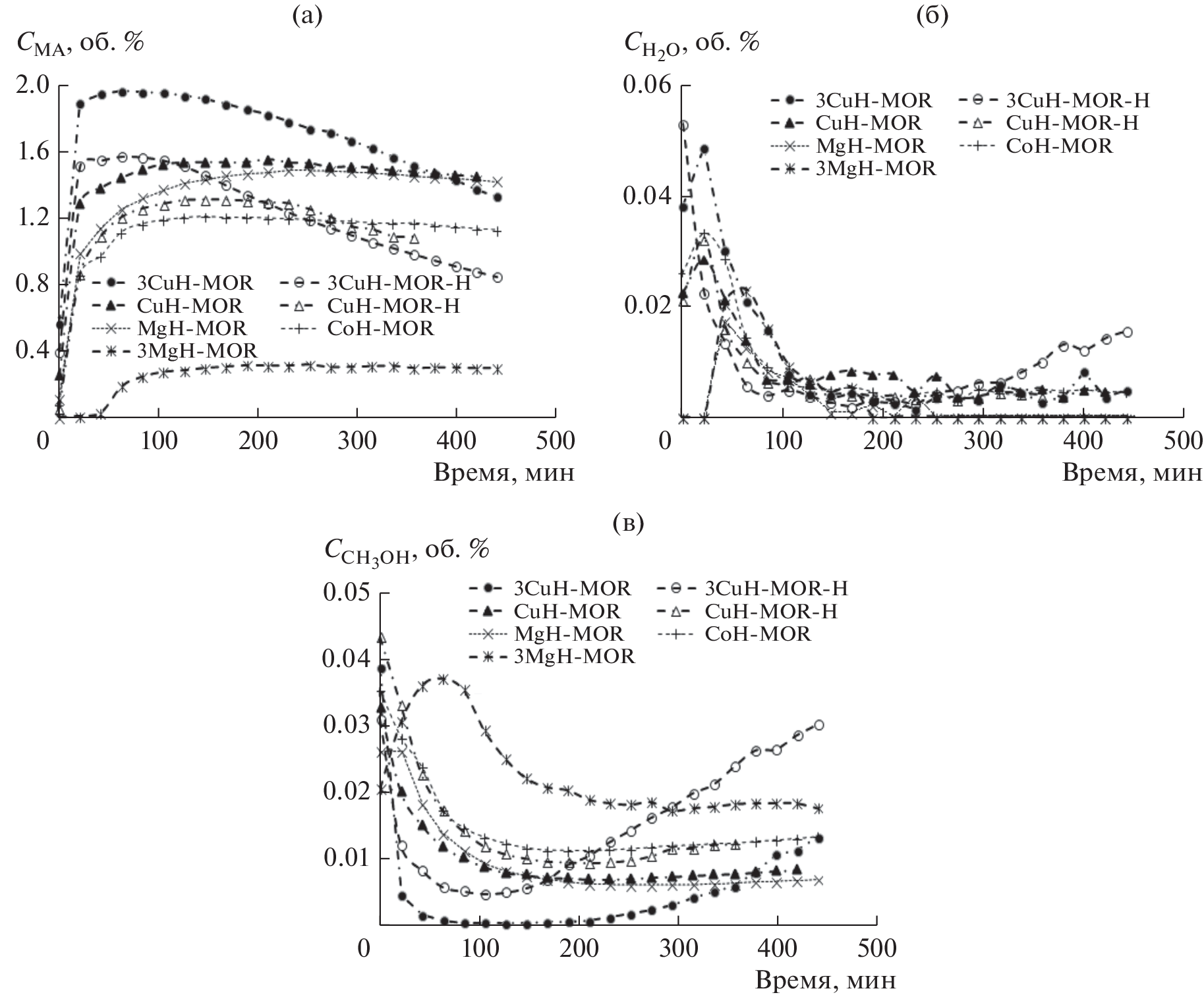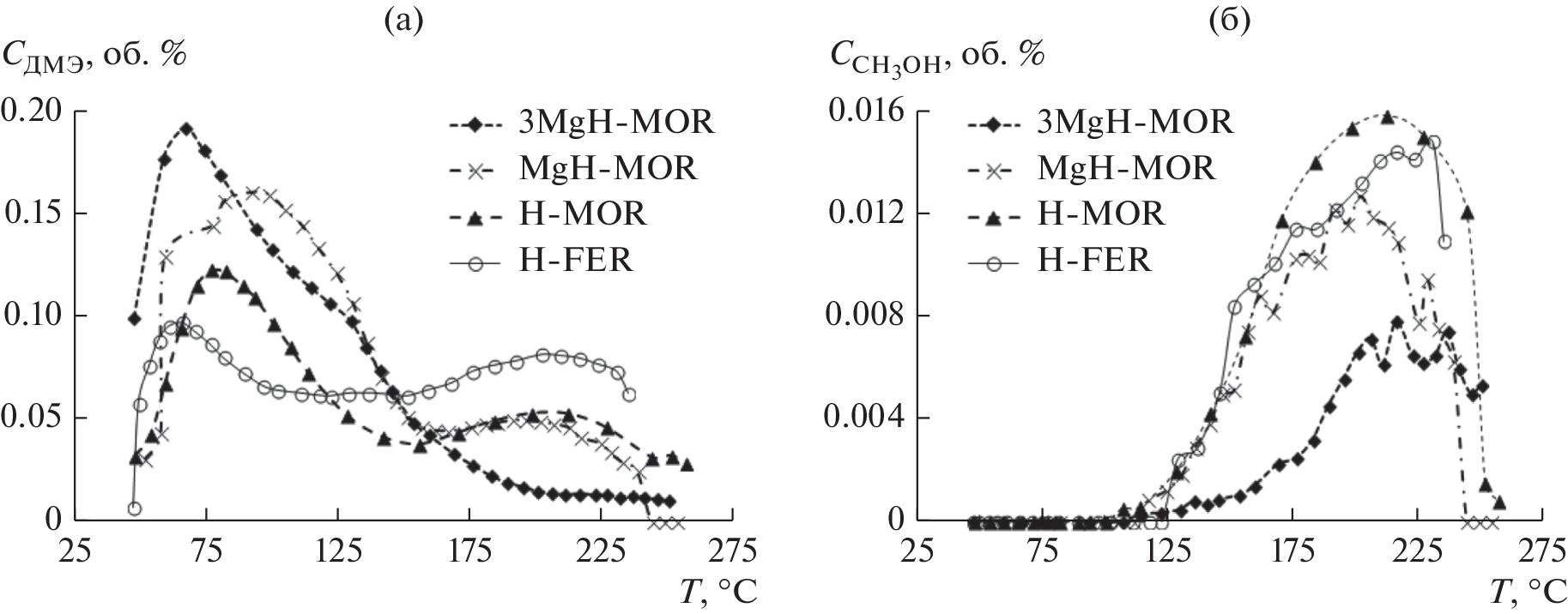 Mordenite and ferrierite (Zeolyst International, H-form, SiO2/Al2O3 ≈ 20) were used to study the adsorption, thermally programmed desorption, and carbonylation of dimethyl ether (DME). The behavior of mordenite with Cu, Co, and Mg cations introduced by ion exchange has also been studied. DME carbonylation was carried out at 200°C, pressure 3 MPa, space velocity 8000 ml g–1 h–1 in a mixture, vol. %: ⁓2.2 DME, 92.8–95.5 CO, rest. N2. After the induction period, the methyl acetate content is about 4–5 times higher for mordenite compared to ferrierite. The formation of water, methanol and hydrocarbons was observed in small quantities. The introduction of Cu, Co, Mg cations into mordenite by ion exchange (single ion exchange, cation/Al ratio no more than 35%) not only increased the stability, but also increased the activity in the DME carbonylation reaction. It was found that an increase in the content of copper (from 1.19 to 2.23 wt %) and Mg (from 0.62 to 1.8 wt %) differently affects the activity. In the case of copper, an increase in activity was observed, while in the case of magnesium, the activity decreased. Preliminary reduction of copper-exchange mordenite leads to a decrease in activity and the appearance of metallic copper particles on the surface of mordenite crystallites. According to in situ diffuse reflectance infrared spectroscopy, the introduction of magnesium cations by triple ion exchange leads to a noticeable decrease in the number of Brønsted acid sites (BACs) in both the 12-MR and 8-MR channels of mordenite. The catalytic characteristics of ferrierite practically do not change when copper and magnesium are introduced by ion exchange.