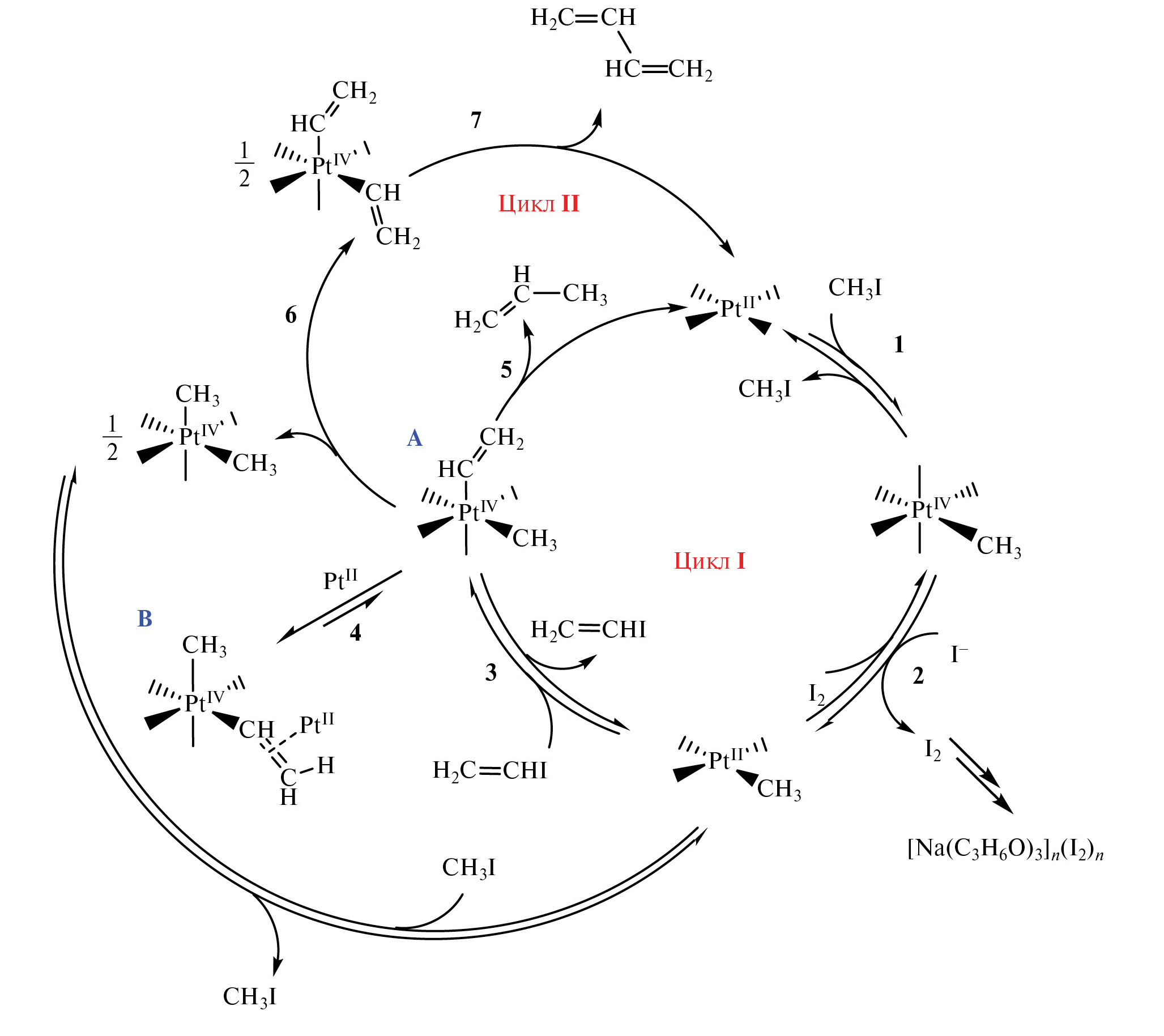 Предполагаемый механизм каталитического C(sp²)–C(sp³)-сочетания включает следующую последовательность стадий. Реакция начинается с обратимого окислительного присоединения метилиодида2 к иодидным комплексам Ptᴵᴵ с образованием метильного комплекса Ptᴵᵛ (схема 2, стадия 1, цикл I), восстановление которого иодид-ионами (стадия 2) генерирует метильное производное Ptᴵᴵ. Протеканию этой стадии способствует обнаруженное ранее [29] сольвентоспецифичное связывание выделяющегося иода ацетоном с избытком NaI в нерастворимый полимерный комплекс [Na(C₃H₆O)₃]n(I₂) n, выпадающий кристаллическим осадком с металлическим блеском.