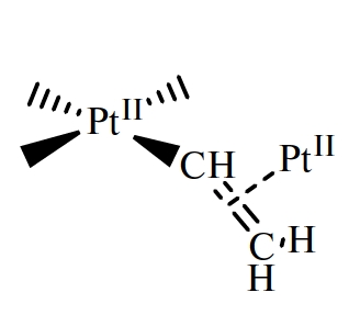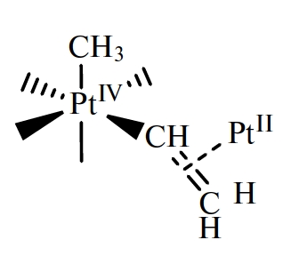 Интермедиат реакции – комплекс Ptᴵᴵ(η²-(H₂C=CH–Ptᴵᵛ–CH₃)). ¹H (δ, м. д.; J, Гц) ацетон-d₆: 6.05 (дд, ³JHᵈHᵇ =13.1; ²JHᵈHᶜ = 1; ³JPtᴵᵛHᵈ = 50, JPtᴵᴵHᵈ = 72, 1H, Hᵈ), 5.92 (дд, ³JHᵇHᵈ = 13.1, ³JHᵇHᶜ = 6.7; 1H, Hᵇ), 5.32 (дд, ³JHᶜHᵇ =6.7, ²JHᶜHᵈ = 1; ³JPtᴵᵛHᶜ = 82.7, JPtᴵᴵHᶜ =76, 1H, Hᶜ), 3.11 (с; JPtᴵᵛHᵃ = 82.1, 3H, Hᵃ). ¹⁹⁵Pt{H} (δ, м. д.) ацетон-d₆: –3977 (Ptᴵᵛ), –4391 (Ptᴵᴵ).