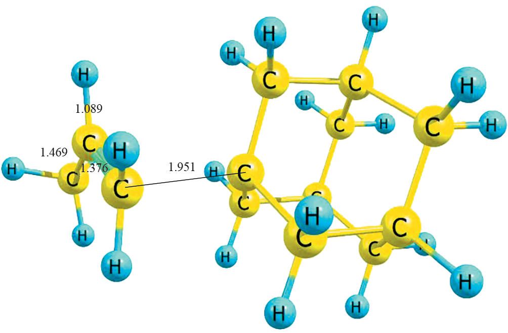 Сканированием поверхности потенциальной энергии (ППЭ) обнаружено, что отсутствует минимум, соответствующий катиону с формулой Ad–СH2–CH2+ , который потенциально мог бы появляться в результате химической реакции между третичным адамантилкатионом и молекулой этилена. В то же время катион подобного строения Ad–CH2–C+H–CH3 (рис. 1) образуется при взаимодействии адамантилкатиона с пропиленом.