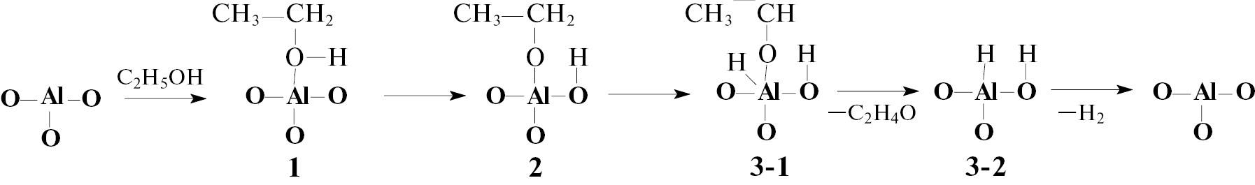 Рис. 4. Механизм взаимодействия молекулы этанола с активным центром, содержащим алюминий, для реакции дегидрирования
