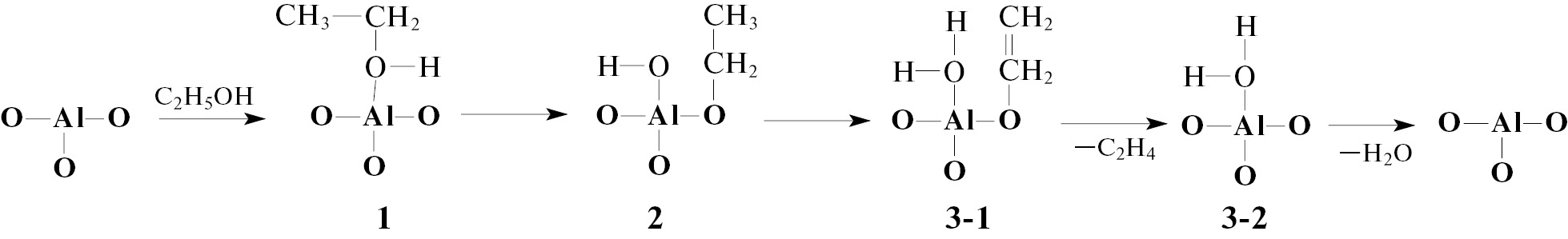 Рис. 3. Механизм взаимодействия молекулы этанола с активным центром, содержащим алюминий, для реакции дегидратации