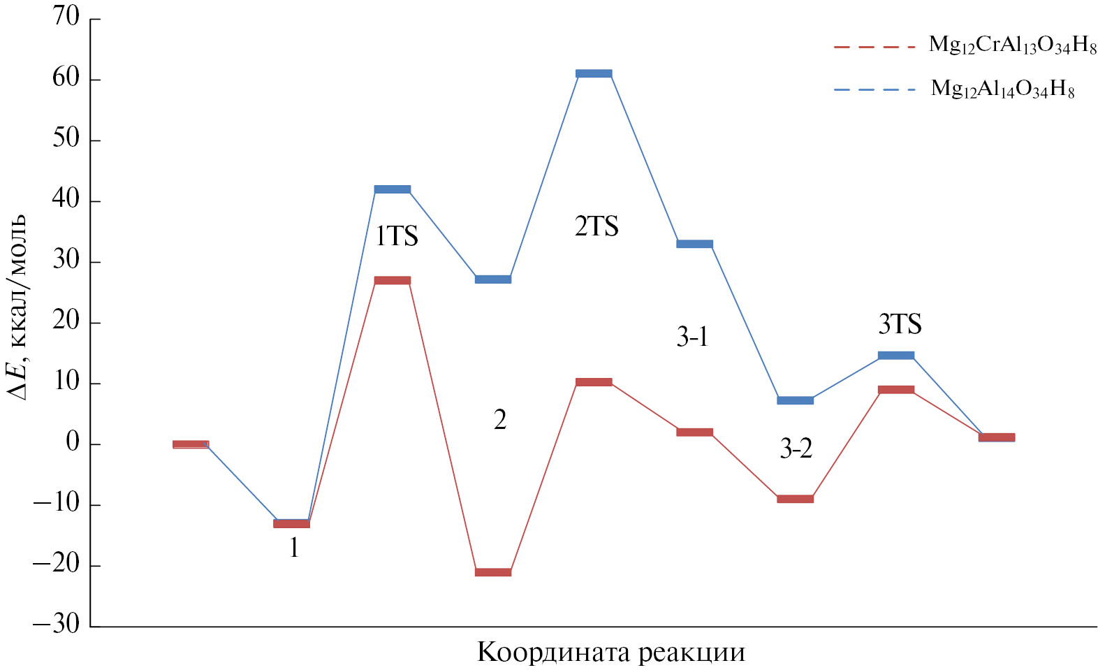 Для дегидратации профили изменения полной энергии для Mg12Al14O34H8 и Mg12CrAl13O34H8 достаточно близки. Как для дегидрирования, наибольший энергетический барьер связан с первым переходным состоянием. Однако в этом случае происходит разрыв связи С–О, а не О–Н. Разница в значениях энергии для кластеров меньше, чем в дегидрировании, и составляет 8.8 ккал/моль. На рис. 7 приведены данные об изменении полной энергии для дегидратации этанола для систем Mg12Al14O34H8 и Mg12CrAl13O34H8.