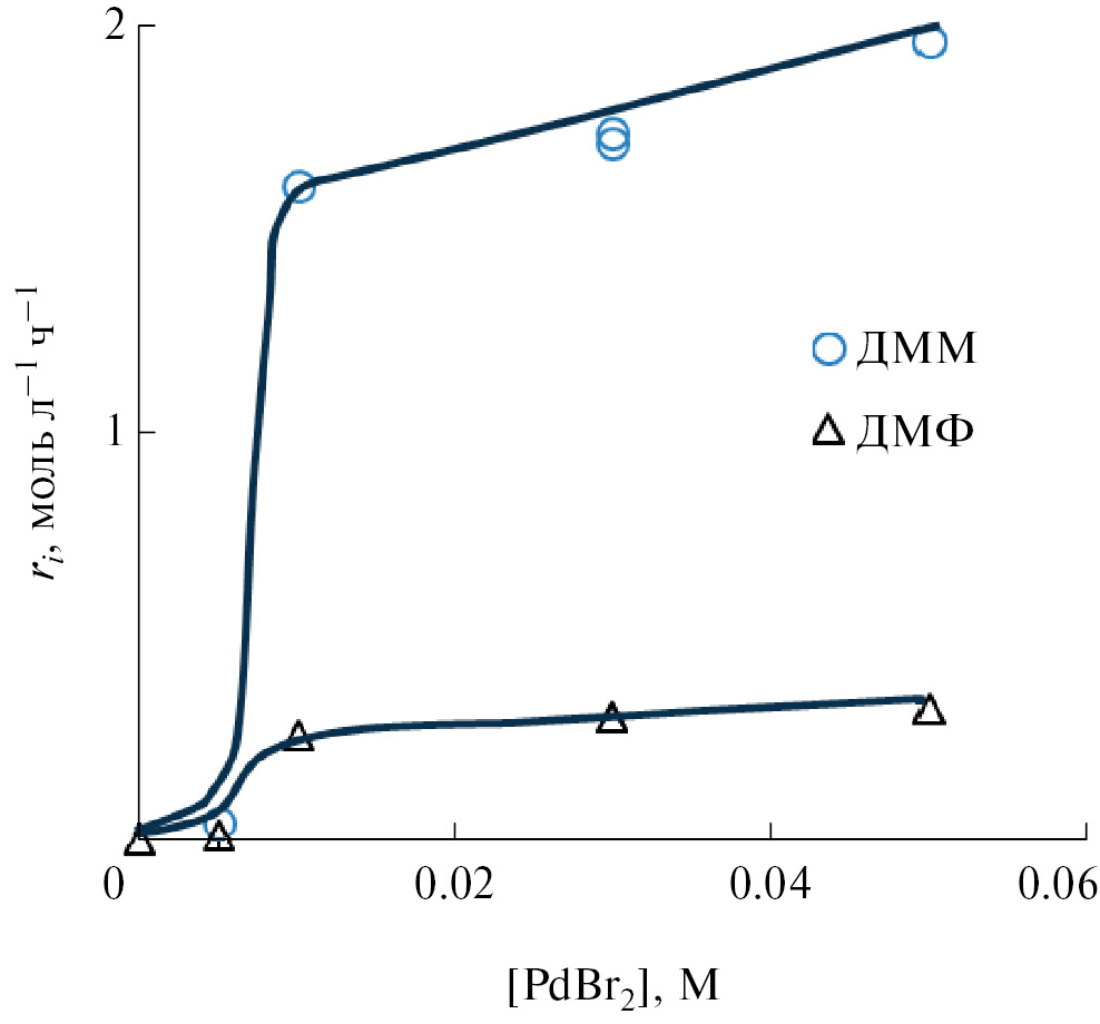 Рис. 2. Зависимость начальной скорости образования ДММ и ДМФ в процессе окислительного карбметоксилирования ацетилена с использованием каталитической системы PdBr2–LiBr–PcCo–АН–MeOH от концентрации бромида палладия. Условия: CLiBr = 0.1 M, CPcCo = 0.03 M, αMeOH = 0.55, состав газа в реакторе: PCO ≈ 42–49 кПа, PC2H2 ≈ 7–12 кПа, PO2 ≈ 6.5–8 кПа