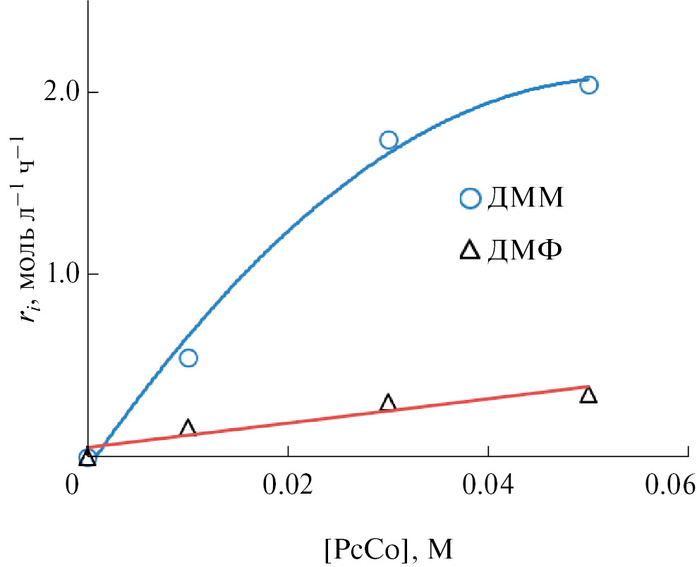 Зависимость r0ДММ и r0ДМФ в присутствии системы PdBr2–LiBr–PcCo–АН–MeOH (αMeOH = 0.55) от концентрации PdBr2 имеет сложный вид (рис. 2). Низкая скорость реакции на первом участке согласуется с данными об активности в процессе дикарбонилирования ацетилена димерных карбонильных комплексов Pd(I), концентрация которых мала при низкой концентрации PdBr2. Дальнейший ход зависимостей, возможно, обусловлен наличием нелинейных стадий в данном процессе. Опыты проводили при достаточно эффективном перемешивании, обеспечиваемом прецессирующей мешалкой с частотой вращения эксцентрика 1100 об/мин. Постоянство начальных скоростей образования ДММ и ДМФ в системе PdBr2–LiBr–PcCo–MeOH при варьировании частоты вращения эксцентрика в диапазоне от 900 до 1100 об/мин (r0ДММ = 1.64 ± 0.10 моль/л·ч, r0ДМФ = 0.16 ± 0.01 моль/л·ч) позволяет сделать предварительный вывод об отсутствии диффузионных органичений, обусловленных медленной скоростью растворения газов. Продемонстрировано также, что скорости и селективности образования продуктов не зависят от концентрации LiBr в диапазоне 0.05 до 0.15 M. Варьирование содержания РсСо от 0.01 до 0.05 М при CPdBr2= 0.03 M показало, что зависимости r0ДММ и r0ДМФ от этого фактора имеют вид кривых с насыщением (рис. 3).