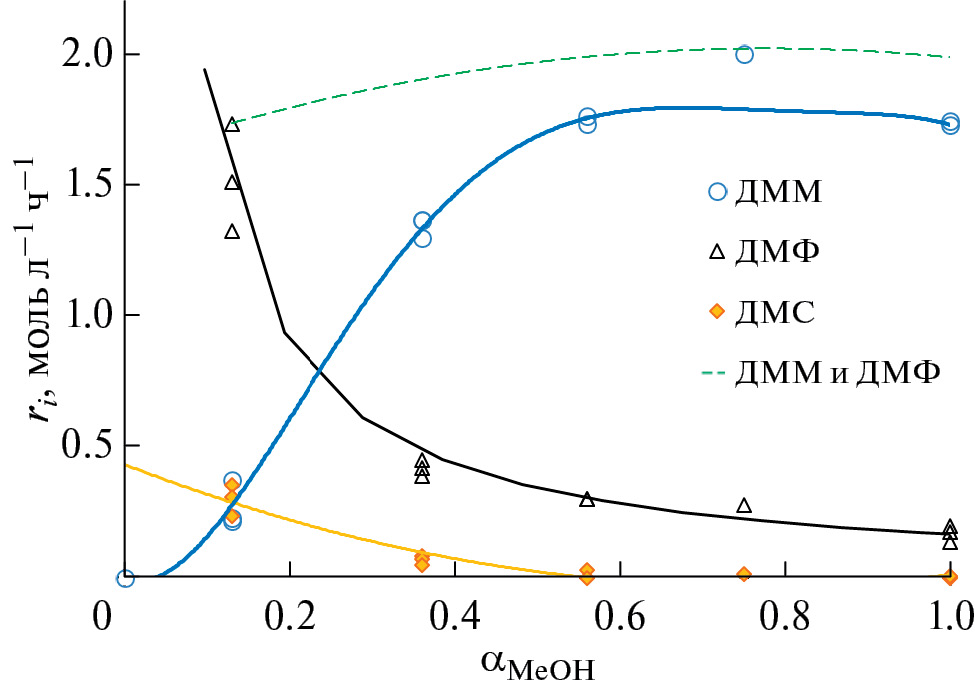 Добавка тиомочевины в изучаемую систему в ходе опыта в условиях синтеза ДМФ (αMeOH = 0.13) приводит к снижению rДМФ и увеличению rДММ (табл. 2, оп. 13, 14). То есть тиомочевина препятствует Z/E-изомеризации ДММ при низкой концентрации MeOH.