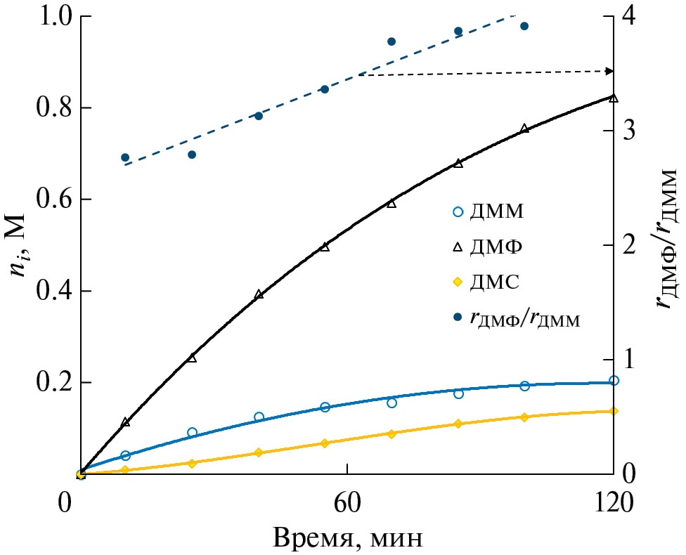 Снижение парциального давления ацетилена до 2–5 кПа не влияет на скорость накопления эфиров ненасыщенных дикарбоновых кислот в опытах с малым содержанием метанола (рис. 5). Анализ зависимости отношения rДМФ/rДММ от времени позволяет говорить о параллельном образовании ДМФ и ДММ. Заметим, что в ходе опыта значение rДМФ/rДММ увеличивается.