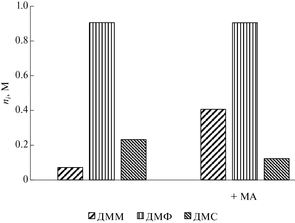 Рис. 6. Сравнение концентраций продуктов, полученных в процессе окислительного карбметоксилирования ацетилена в опытах с добавкой МА и без нее. Условия: система PdBr2–LiBr–PcCo–АН–MeOH, CPdBr2 = 0.03 M, CLiBr = 0.1 M, CPcCo = 0.03 M, αMeOH = 0.13, состав газа в реакторе: PCO ≈ 47–51 кПа, PC2H2 ≈ 11–15 кПа, PO2 ≈ 4–7 кПа