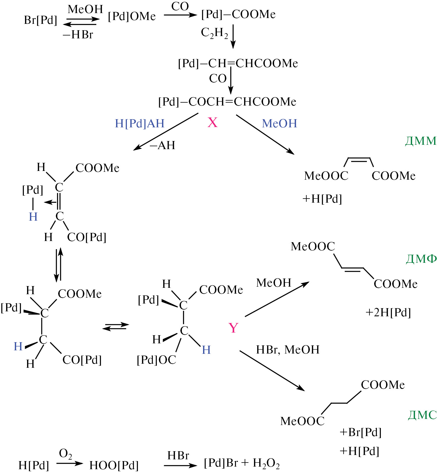 Скорость процесса определяется концентрацией активных комплексов палладия. Ключевыми интермедиатами, входящими в узлы сопряжения в предложенном механизме, являются интермедиаты Х и Y. Возможность двух направлений распада интермедиата Х (под действием MeOH или в присутствии H[Pd](AH)) позволяет объяснить образование ДММ и ДМФ. Стадия нуклеофильного замещения [Pd] метилатной группой приводит к деметаллированию Х и получению ДММ и Н[Pd]. Использование окислителя (РсСо и О2) способствует окислению Н[Pd] и делает процесс карбметоксилирования ацетилена каталитическим (маршрут I). Наличие дополнительного растворителя ведет к формированию катализатора Z/E-изомеризации H[Pd](AH). Уменьшение концентрации метанола замедляет скорость распада интермедиата Х по стадии деметаллирования. Одновременное увеличение САН приводит к росту концентрации H[Pd](AH), что способствует повышению скорости конкурирующего маршрута образования ДМФ в результате обратимого присоединения Х к H[Pd](AH) (маршрут II). Существенным отличием рассматриваемых маршрутов является наличие нелинейных стадий в маршруте II. Образование гидридов палладия происходит в I и во II маршрутах, а также в процессе синтеза МА в опытах с низкой концентрацией MeOH (на схеме 2 этот маршрут не указан).