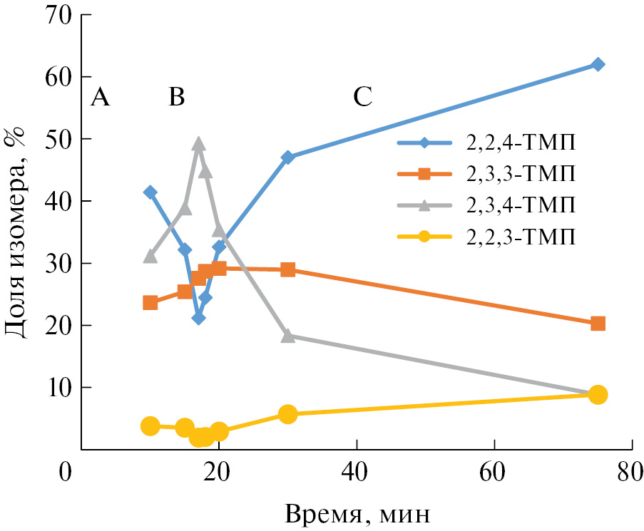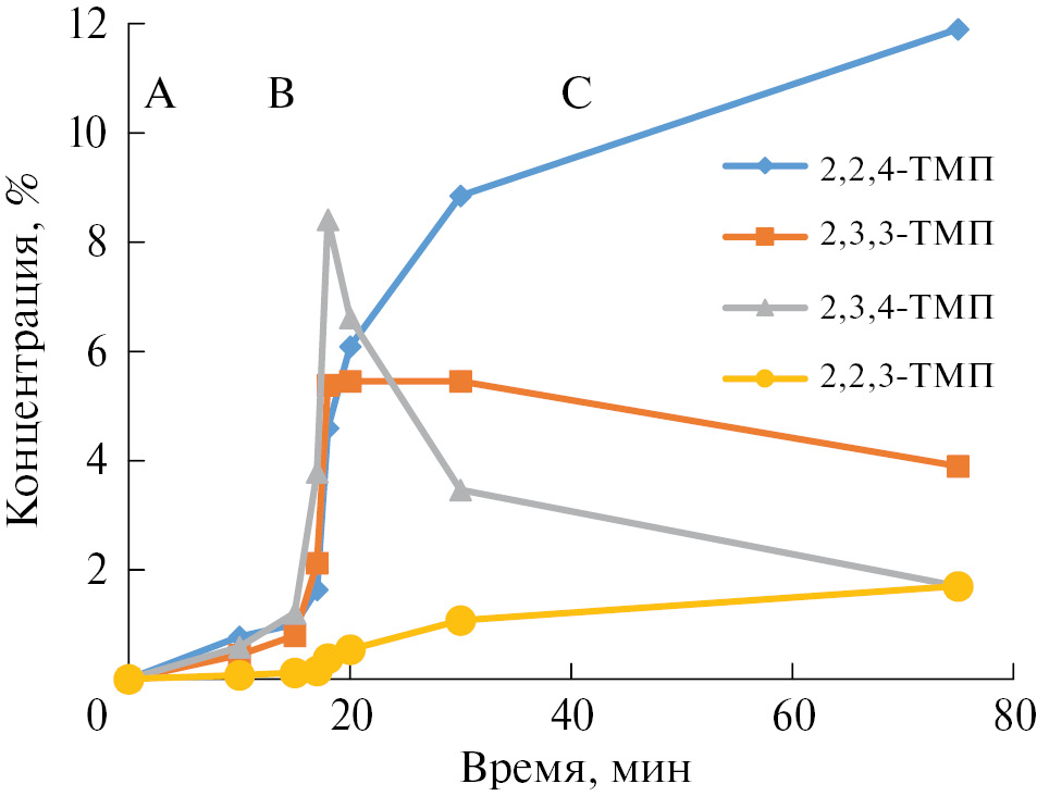 В периоде C наблюдается относительно медленное изменение концентраций изомеров TMP, обусловленное протеканием реакций изомеризации. Продукты кислотно-каталитического крекинга при этом отсутствуют. Изомеризация протекает высокоселективно. В конечном состоянии системы должно установиться равновесие, время достижения которого существенно превышает длительность эксперимента. Видно, что доля 2,2,4-ТМП и 2,2,3-ТМП монотонно растет, доля 2,3,4-ТМП и 2,3,3-ТМП – монотонно падает. При этом 2,2,3-ТМП остается минорным продуктом, его доля составляет 9% от суммы ТМП на 75-той минуте реакции.