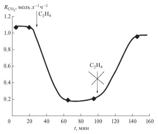 Следующим этапом было добавление в систему газообразных субстратов (этилена и пропилена). Нами проведены опыты по гидрокарбоксилированию этилена и пропилена. В реакционных растворах были идентифицированы продукты гидрокарбоксилирования легких алкенов: в случае этилена – пропионовая, в случае пропилена – н-масляная и изомасляная кислоты соответственно, хроматографическим анализом в сравнении с чистыми образцами и с помощью ИК-спектроскопии. Показано, что при введении этилена и пропилена в реакционную систему PdBr2–CuBr2–ТГФ–Н2О + СО, О2 в ходе процесса значительно уменьшается скорость образования СО2 (RСО2). В качестве примера на рис. 1 приведена зависимость, полученная при добавлении в систему С2Н4. Через полчаса после начала его подачи RСО2 снижается примерно в 5 раз, а после прекращения поступления этилена в реактор возрастает и достигает практически того же значения, которое она имела до введения этилена. Аналогичная зависимость наблюдается и в случае использования пропилена.