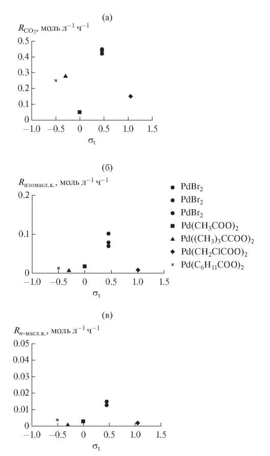 В работе [8] было исследовано влияние природы аниона в соли палладия на характер сопряженного процесса гидрокарбоксилирования циклогексена и проведено сравнение активности каталитической системы PdX2–CuBr2–ТГФ–Н2О при использовании различных соединений палладия (бромида, ацетата, хлорацетата, пивалата и циклогексилкарбоксилата). Показано, что скорость образования основного продукта сопряженного процесса (циклогексанкарбоновой кислоты) мало зависит от донорно-акцепторных свойств аниона, но его размер влияет на скорости окисления монооксида углерода и гидрокарбоксилирования циклогексена [8]. В случае сопряженного процесса гидрокарбоксилирования пропилена нами было изучено влияние природы анионов на региоселективность процесса. Литературные данные о значениях полярного (σt) и стерического (Еs) эффектов (констант уравнения Тафта) для анионов [9], а также полученные данные для скоростей образования продуктов (Rпрод) сведены в табл. 2. Воспроизводимость опытов проверяли в экспериментах с использованием бромида палладия. Проведенные три опыта показали удовлетворительную воспроизводимость (табл. 2, на рис. 3 этим опытам соответствуют круглые значки). Четкой зависимости скоростей образования продуктов от полярного эффекта, как и при гидрокарбоксилировании циклогексена, не наблюдается, т.е. электронные свойства анионов и в этом случае мало влияют на скорости образования СО2 (RCO2) (рис. 3а) и кислот (Rн-масл.к. и Rизомасл.к.) (рис. 3б, 3в).