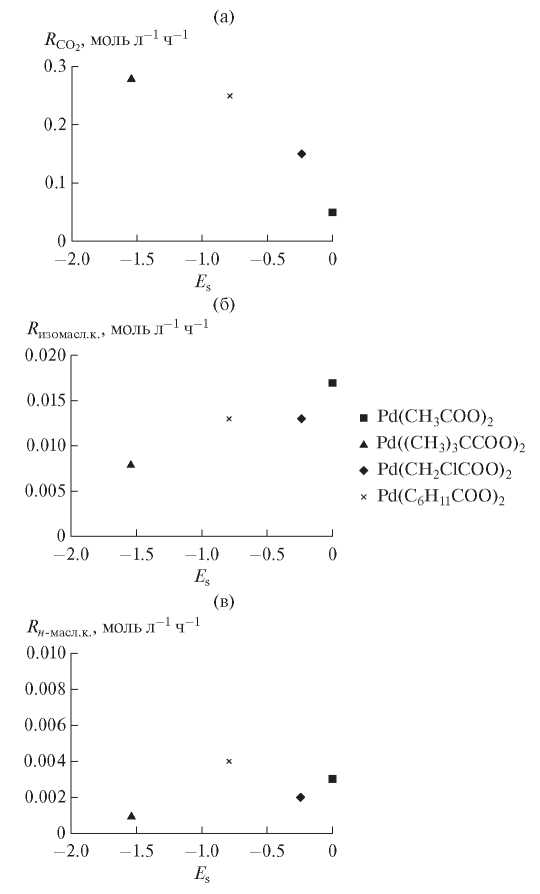 При уменьшении размера аниона (изменении Es от –2 до 0) RCO2 уменьшается (рис. 4а), а Rн-масл.к. и Rизомасл.к. увеличиваются (рис. 4б, 4в), но на региоселективность процесса стерические свойства влияют мало. Во всех проведенных опытах преобладает образование изомасляной кислоты (Rизомасл.к. в несколько раз превышает Rн-масл.к.).