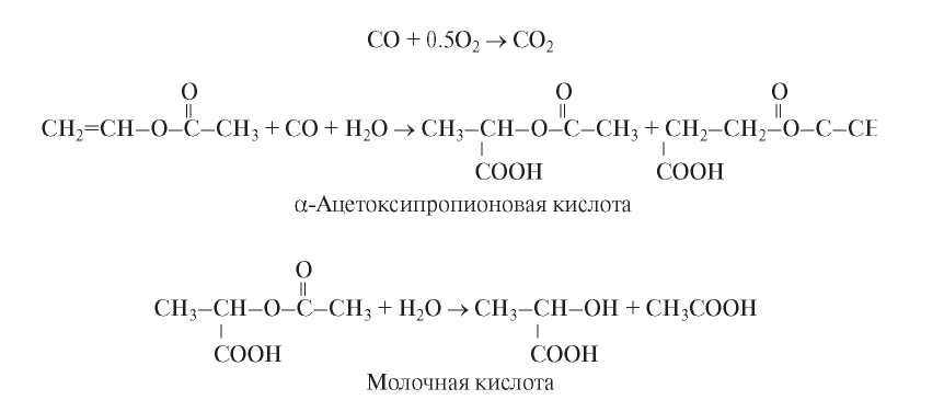 2) В реакционных системах PdBr2–CuBr2–органический растворитель–H2O–винилацетат + CO, O2 были идентифицированы карбоновые кислоты: муравьиная, акриловая и пропионовая. Образование муравьиной кислоты подтверждает присутствие необходимого для сопряженного процесса гидридного комплекса палладия. Однако, вероятно из-за акцепторного эффекта ацетатной группы, гидрокарбоксилирование винилацетата до α-ацетоксипропионовой кислоты в мягких условиях не наблюдается.